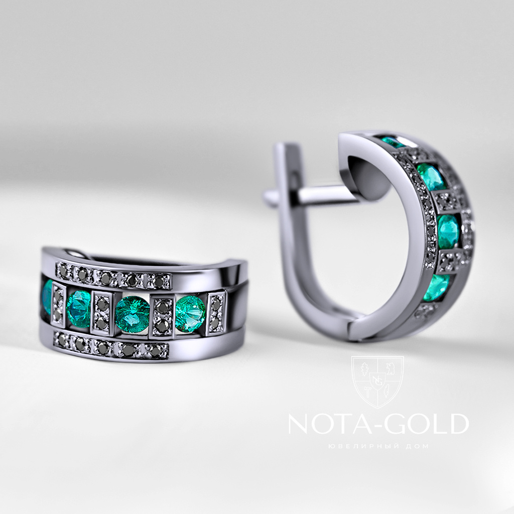 Женские серьги из белого золота с бриллиантами и изумрудами (Вес 7,4 гр.)