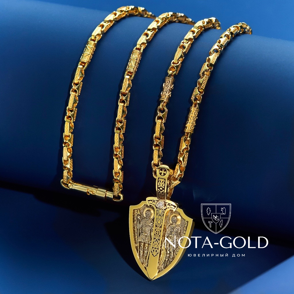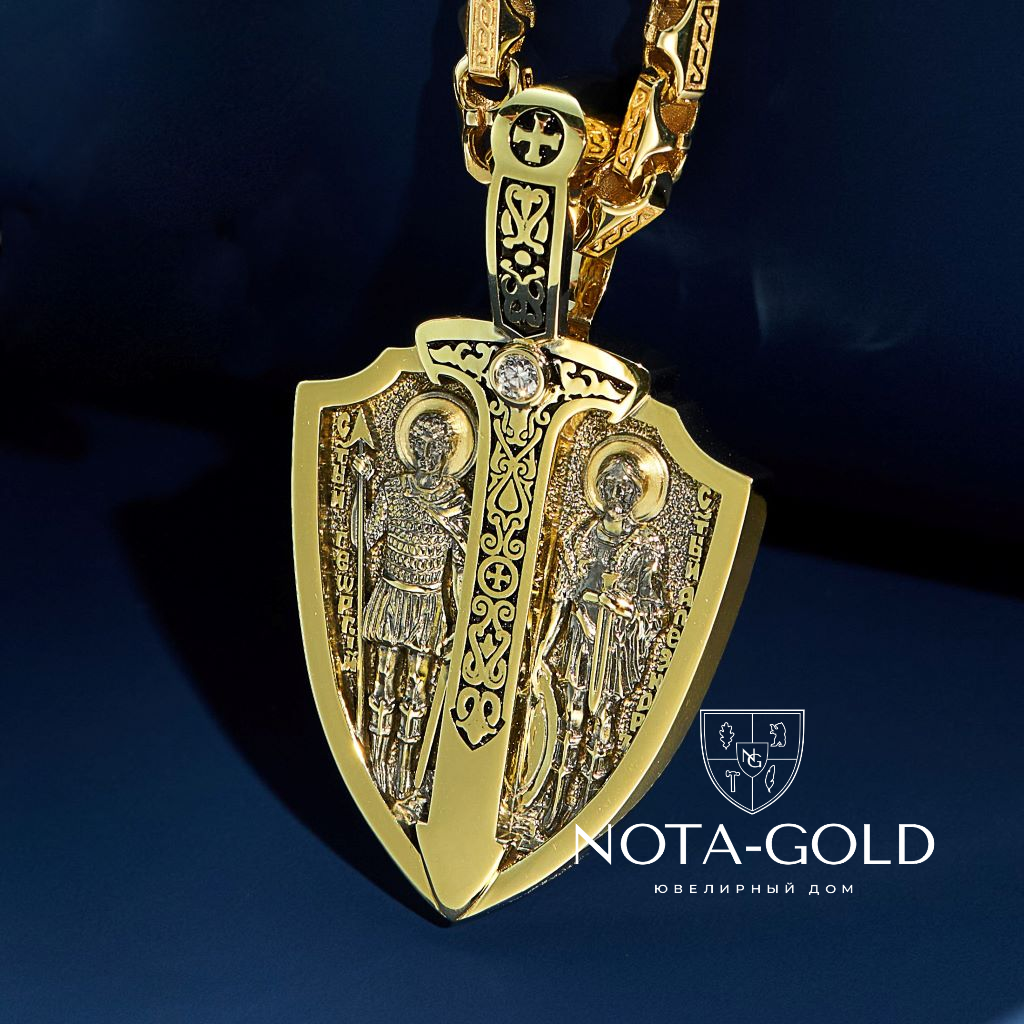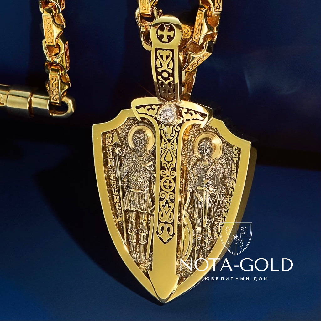 Нательная иконка Щит и Меч из желтого золота с бриллиантом (Вес 29,3 гр.)