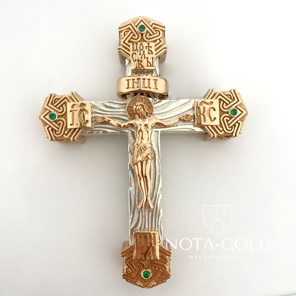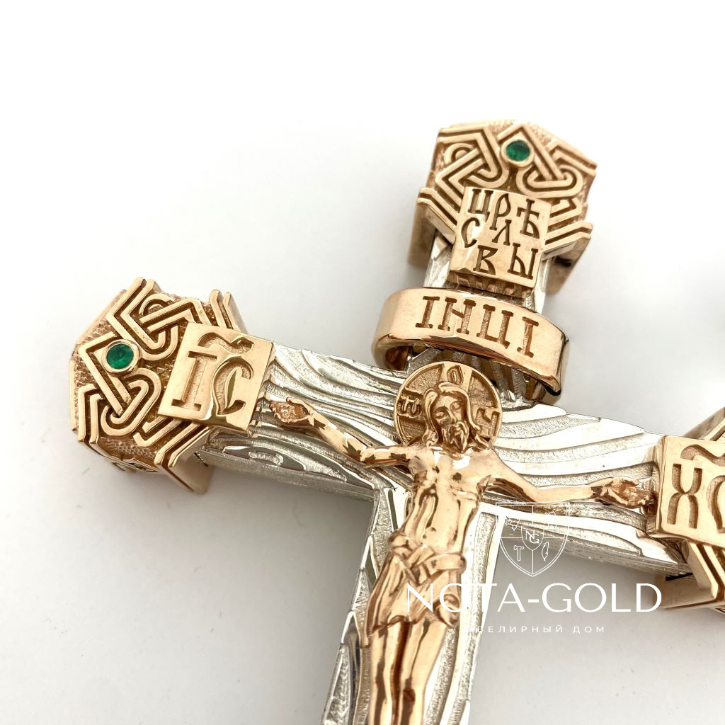 Большой православный серебряный крест с золочением и изумрудами (Вес 214 гр.)