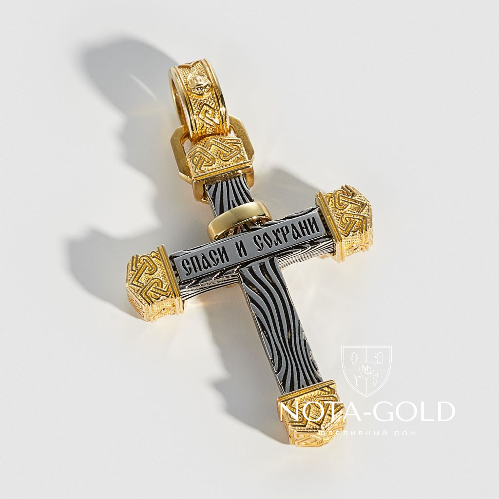 Нательный малый православный мужской крестик с чернёным узором из серебра с позолотой (Вес: 10 гр.)