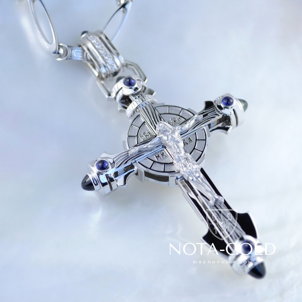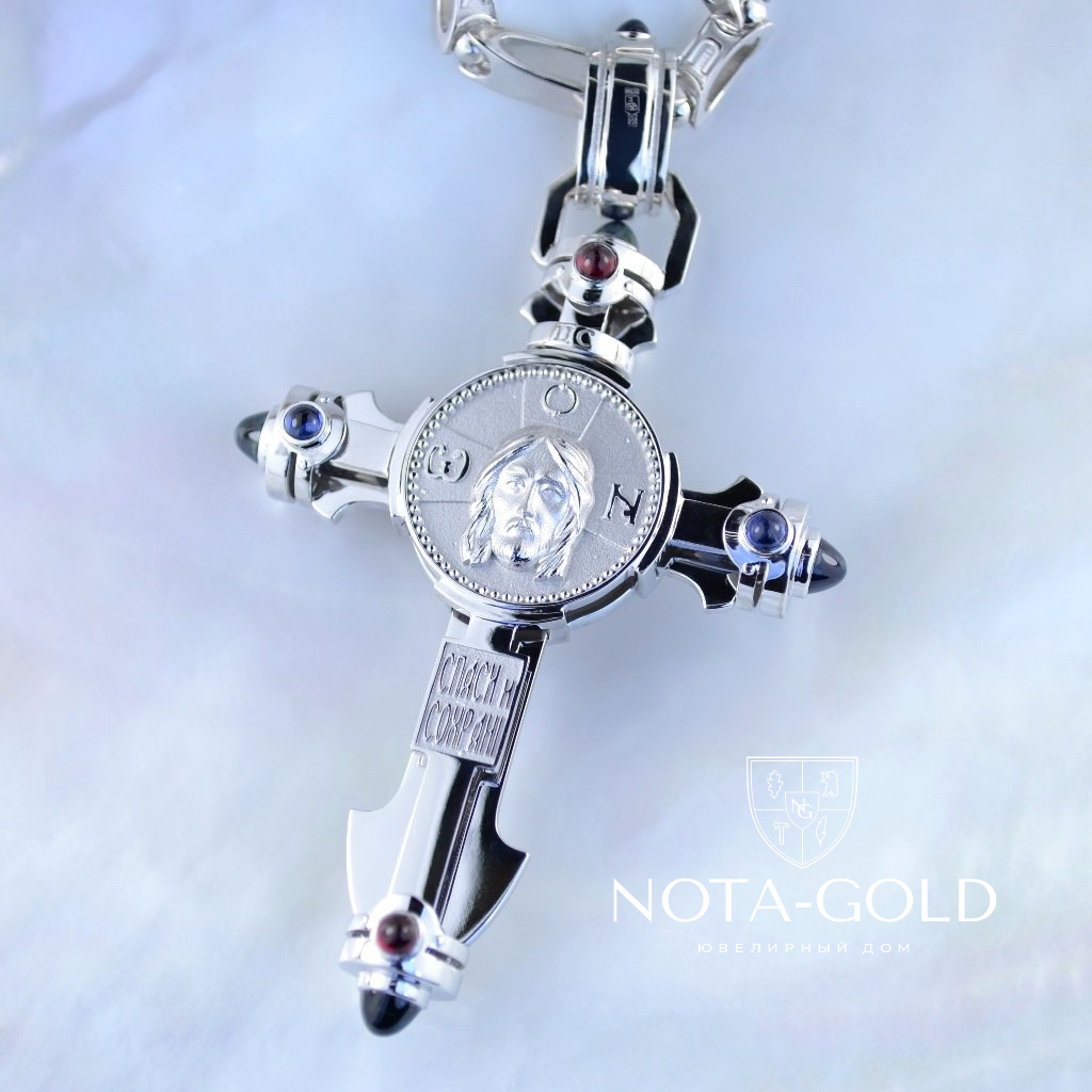 Мужской нательный золотой крест из серебра с распятием и драгоценными камнями (Вес 28 гр.)