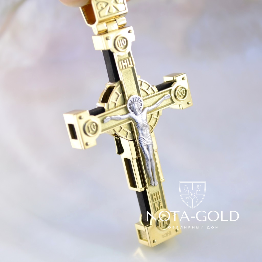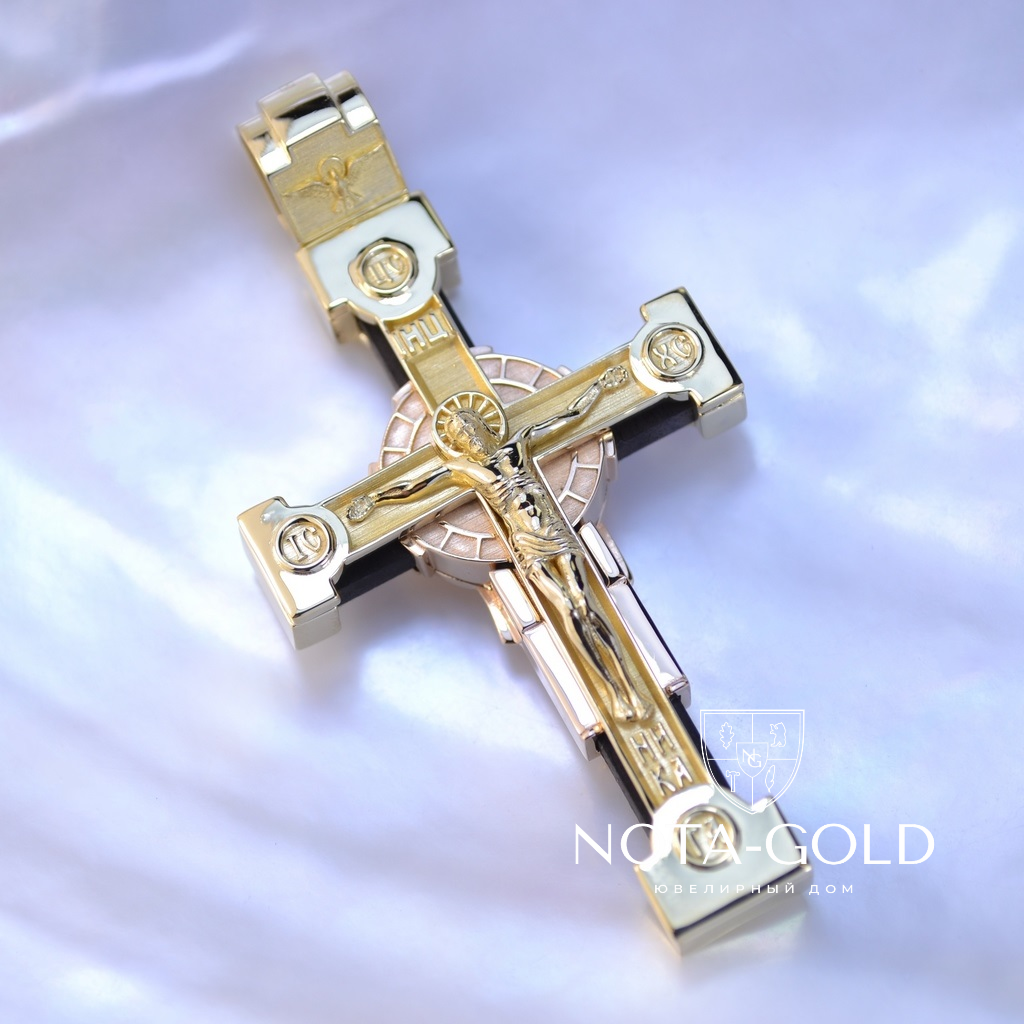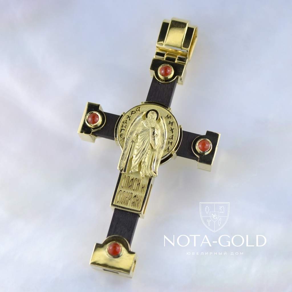 Нательный золотой крест с рубинами, распятием и образом Архангела Михаила (Вес 32 гр.)