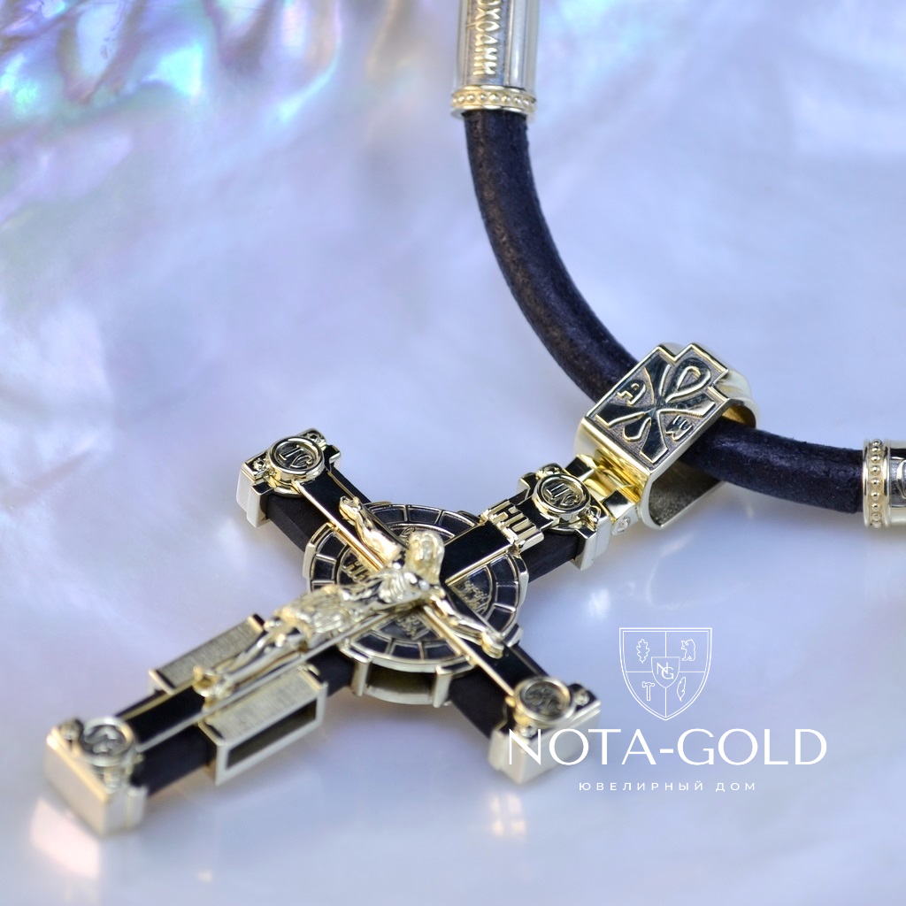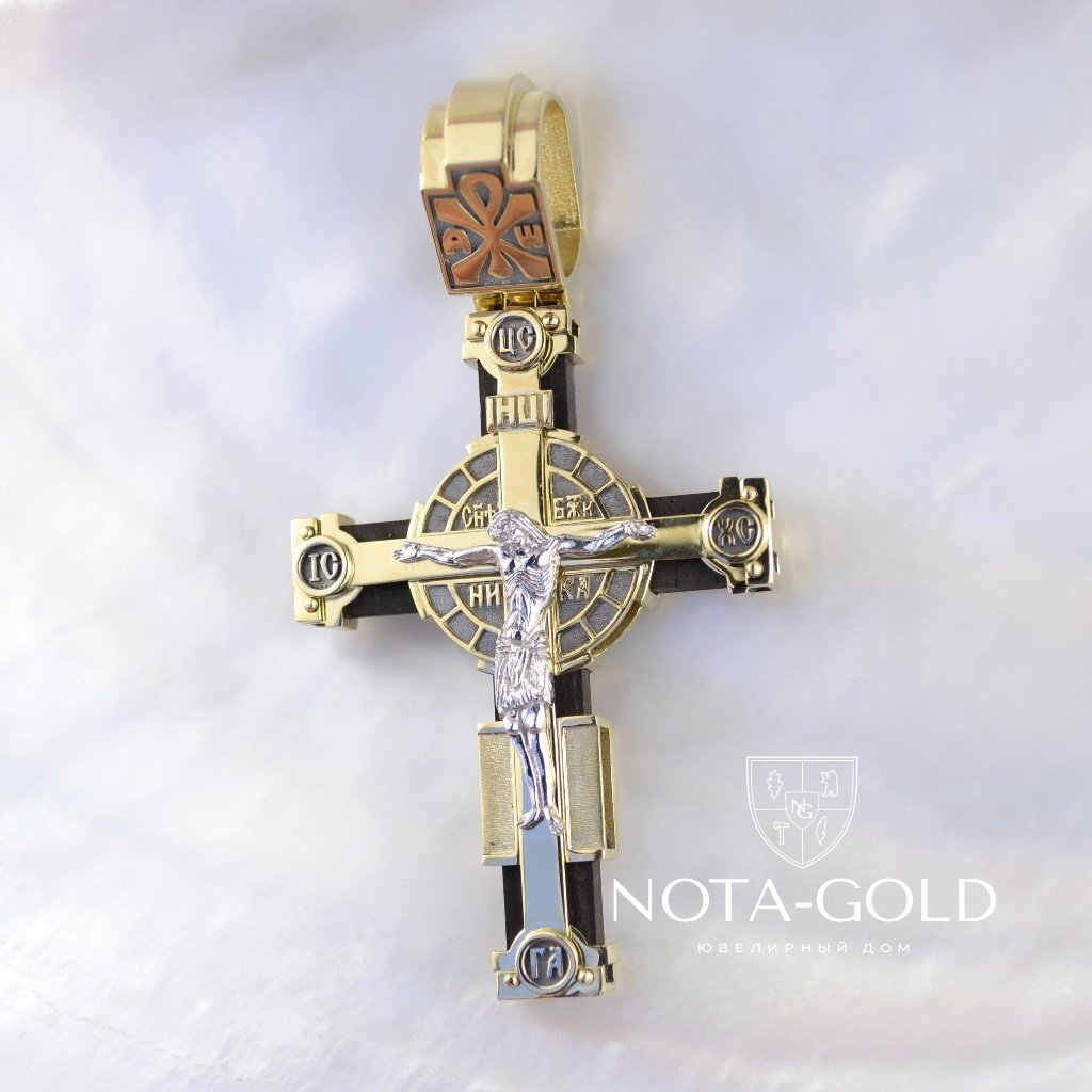 Авторский нательный крест из серебра с позолотой с деревом Эбен, распятием и образом иконы Спас Нерукотворный (Вес 24 гр.)