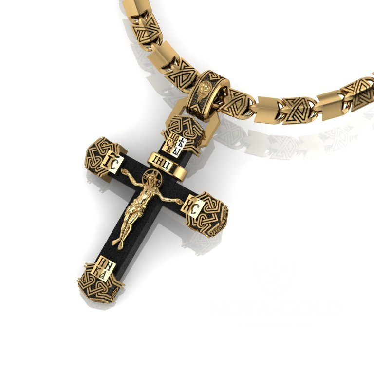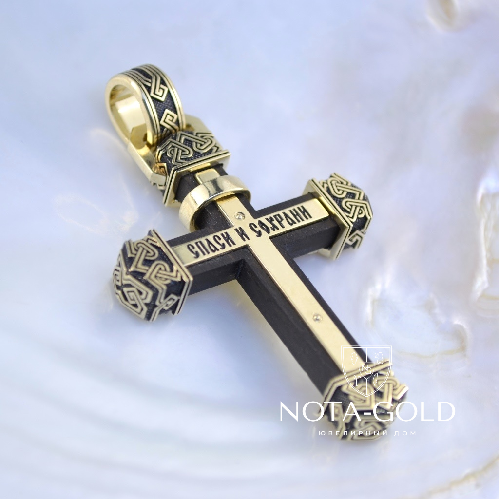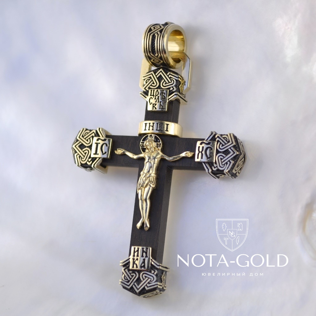 Большой мужской православный крестик из чёрного дерева и чернёного серебра с позолотой (Вес: 16 гр.)