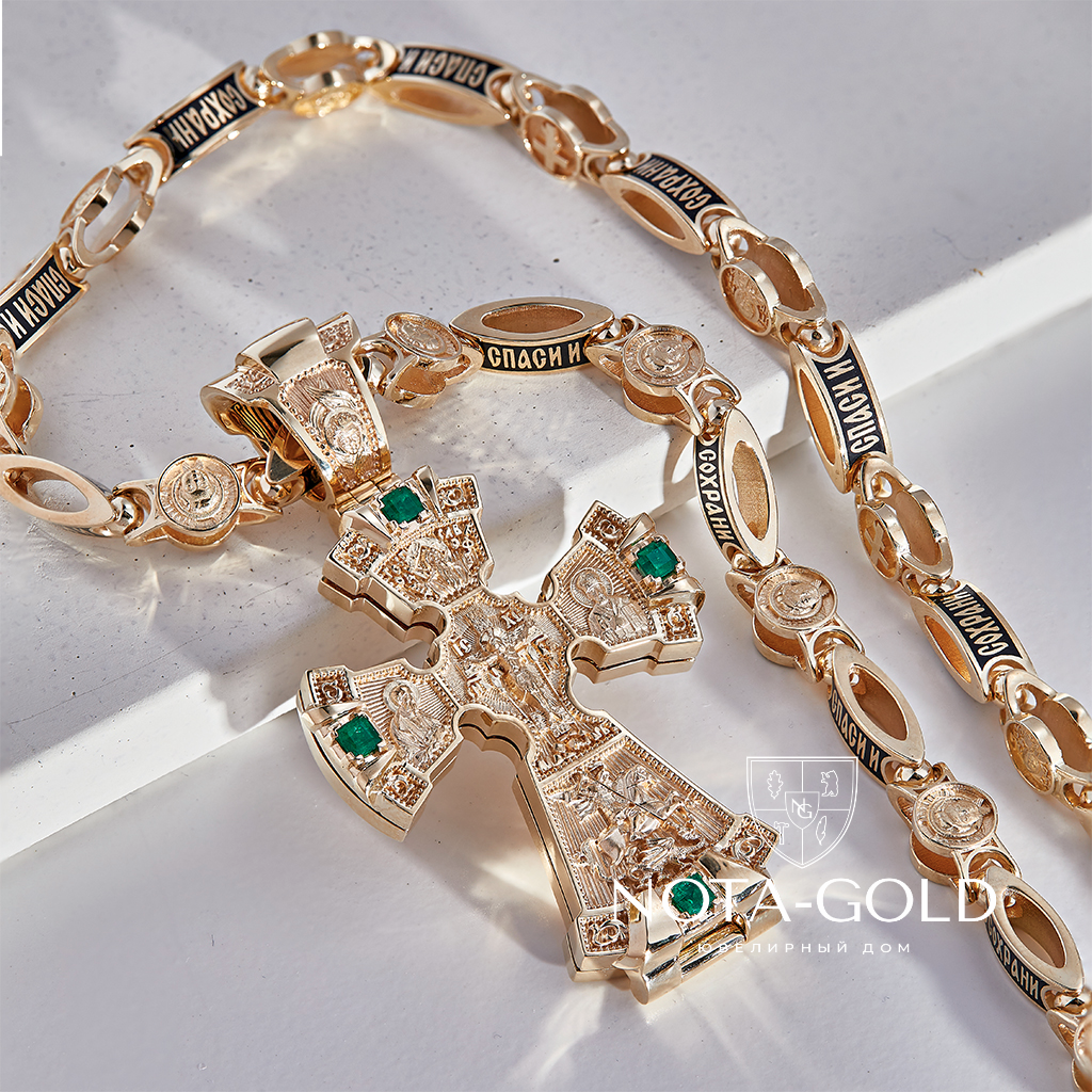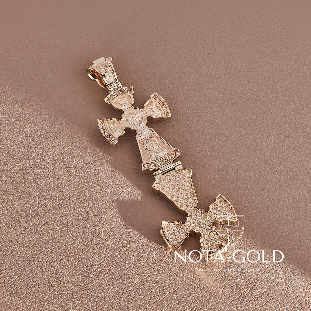 Раскрывающейся крест-мощевик из позолоченного серебра с цветными фианитами и ликами святых (Вес: 36 гр.)