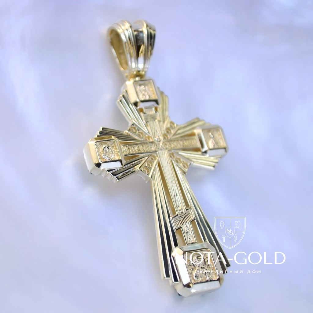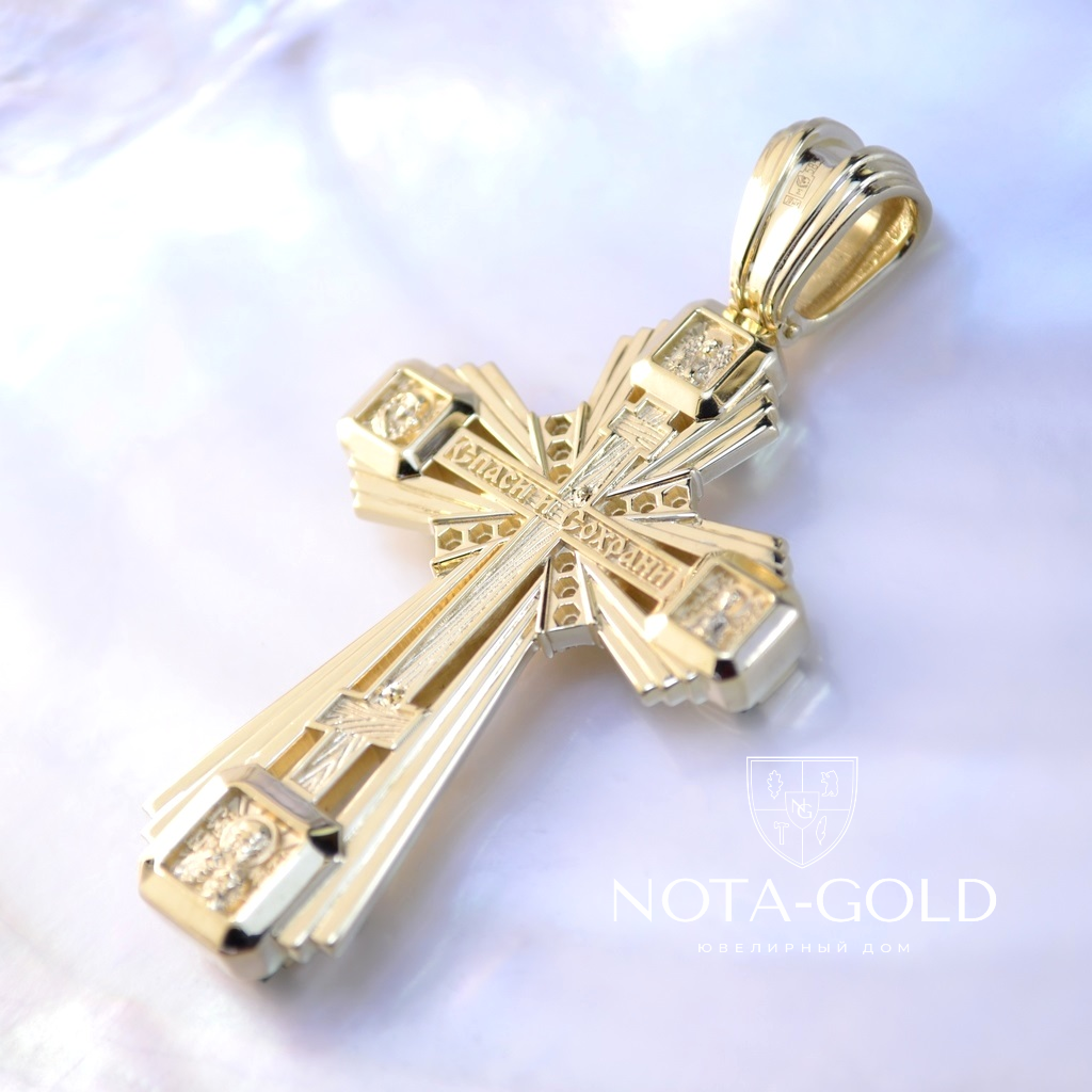 Серебряный крест с позолотой ручной работы Спаси и сохрани с ликами святых и цветными фианитами (Вес 12 гр.)
