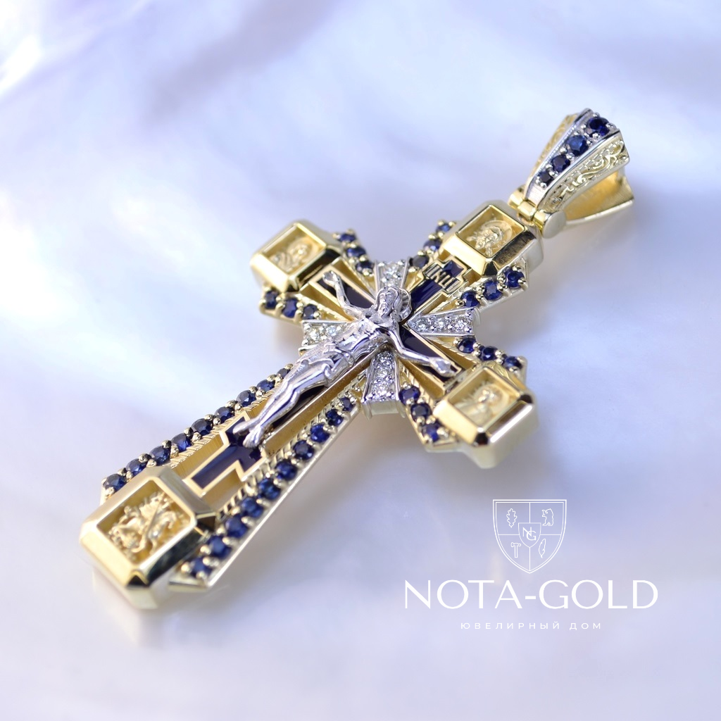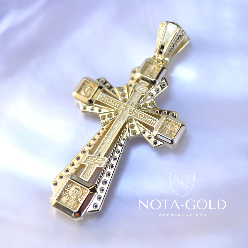 Серебряный крест с позолотой ручной работы с ликами святых и цветными фианитами (Вес 11 гр.)