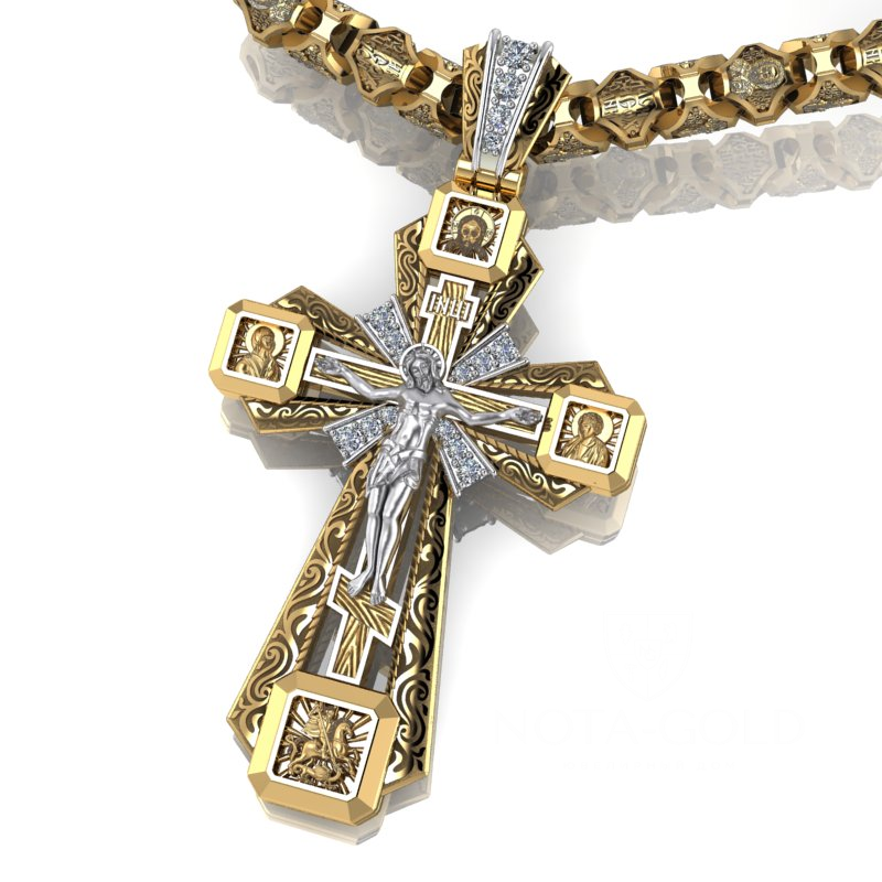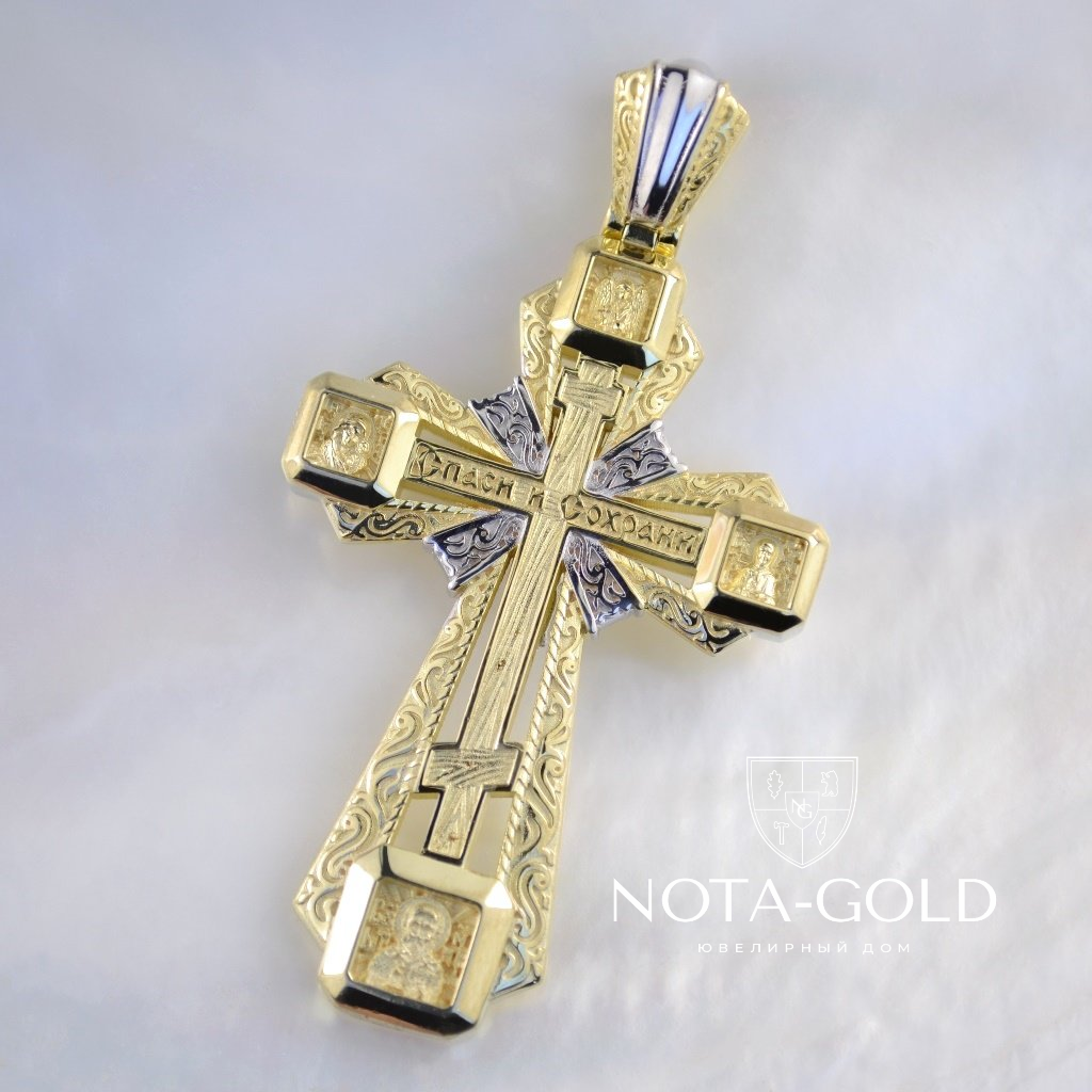 Серебряный крест с позолотой ручной работы с ликами святых, узором и фианитами (Вес 11 гр.)