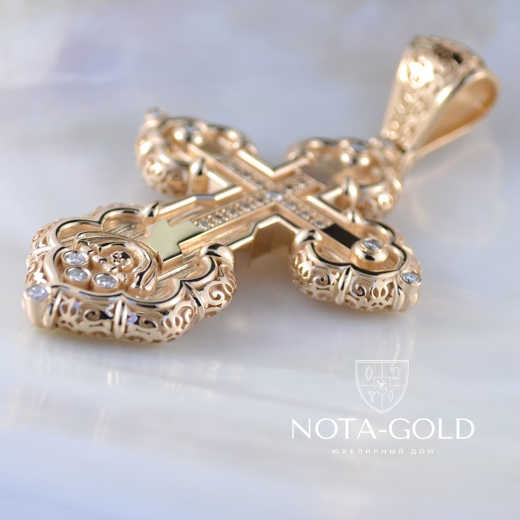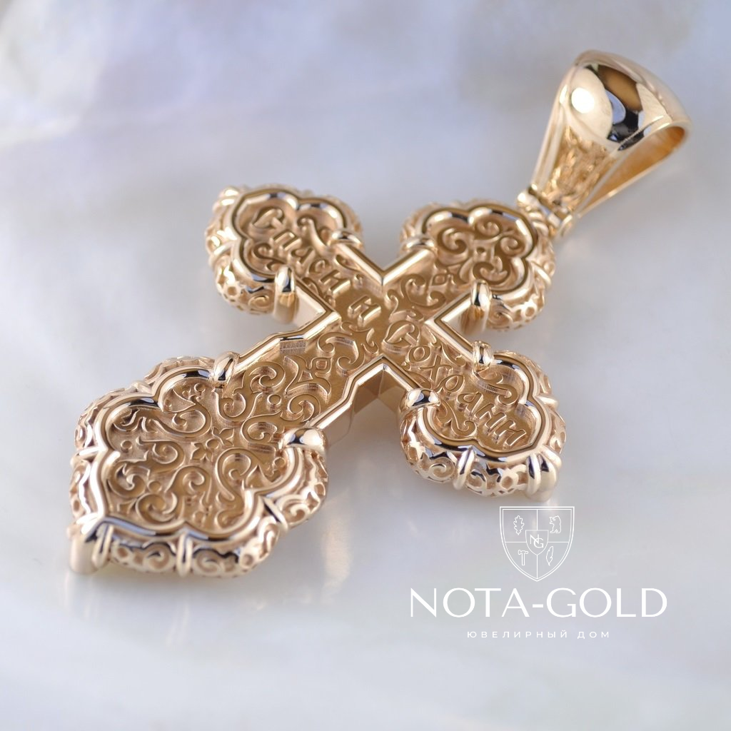 Ажурный православный серебряный крест с позолотой, фианитами и гравировкой Спаси и сохрани (Вес 67 гр.)