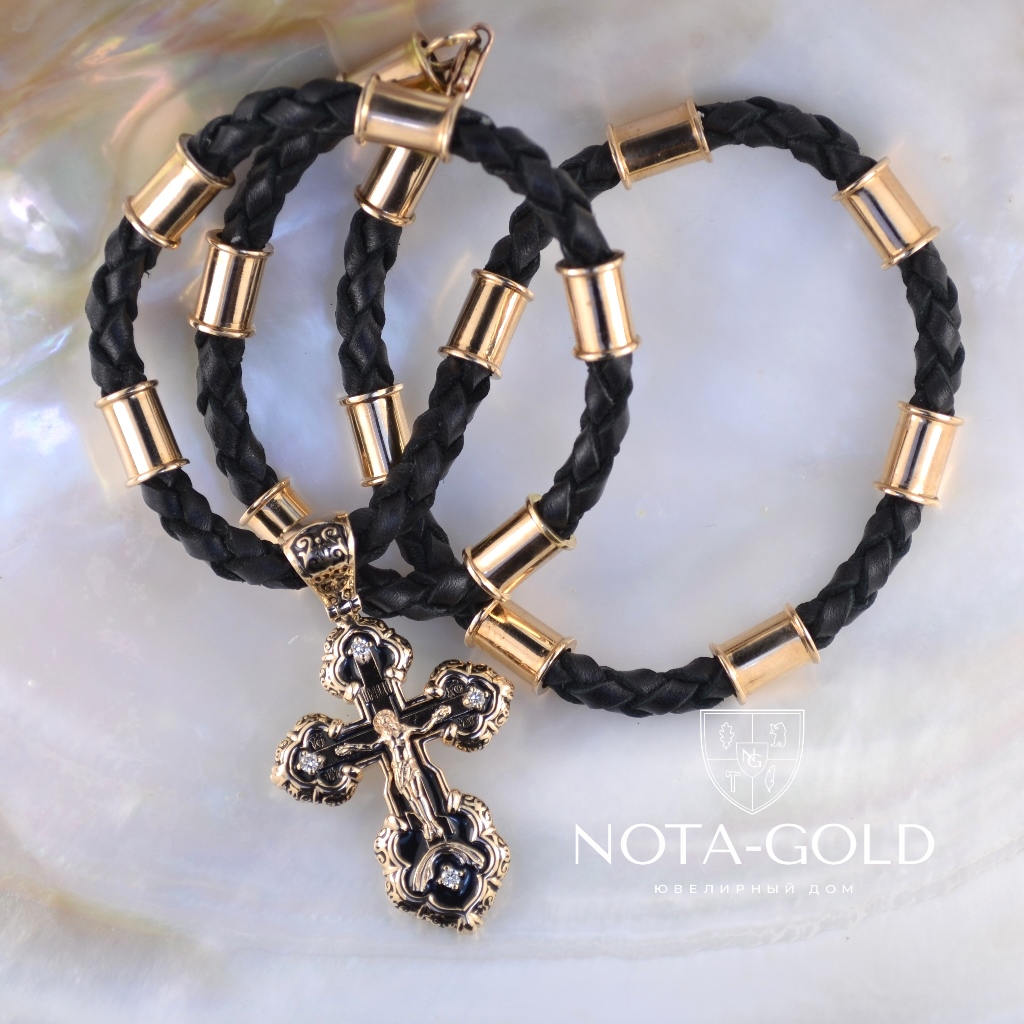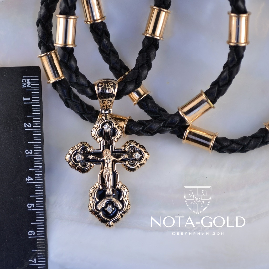 Большой мужской крест с чёрной эмалью и фианитами на кожаном гайтане со вставками из серебра с позолотой (Вес 35 гр.)