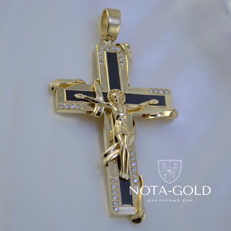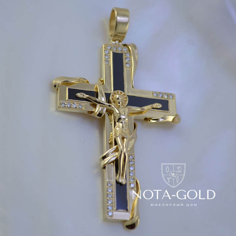 По желанию Заказчика можно изготовить данный эксклюзивный золотой крестик в сочетаниях: чёрный оникс и бриллианты; фианит чёрный и фианиты бесцветные; чёрная эмаль и фианиты бесцветные.