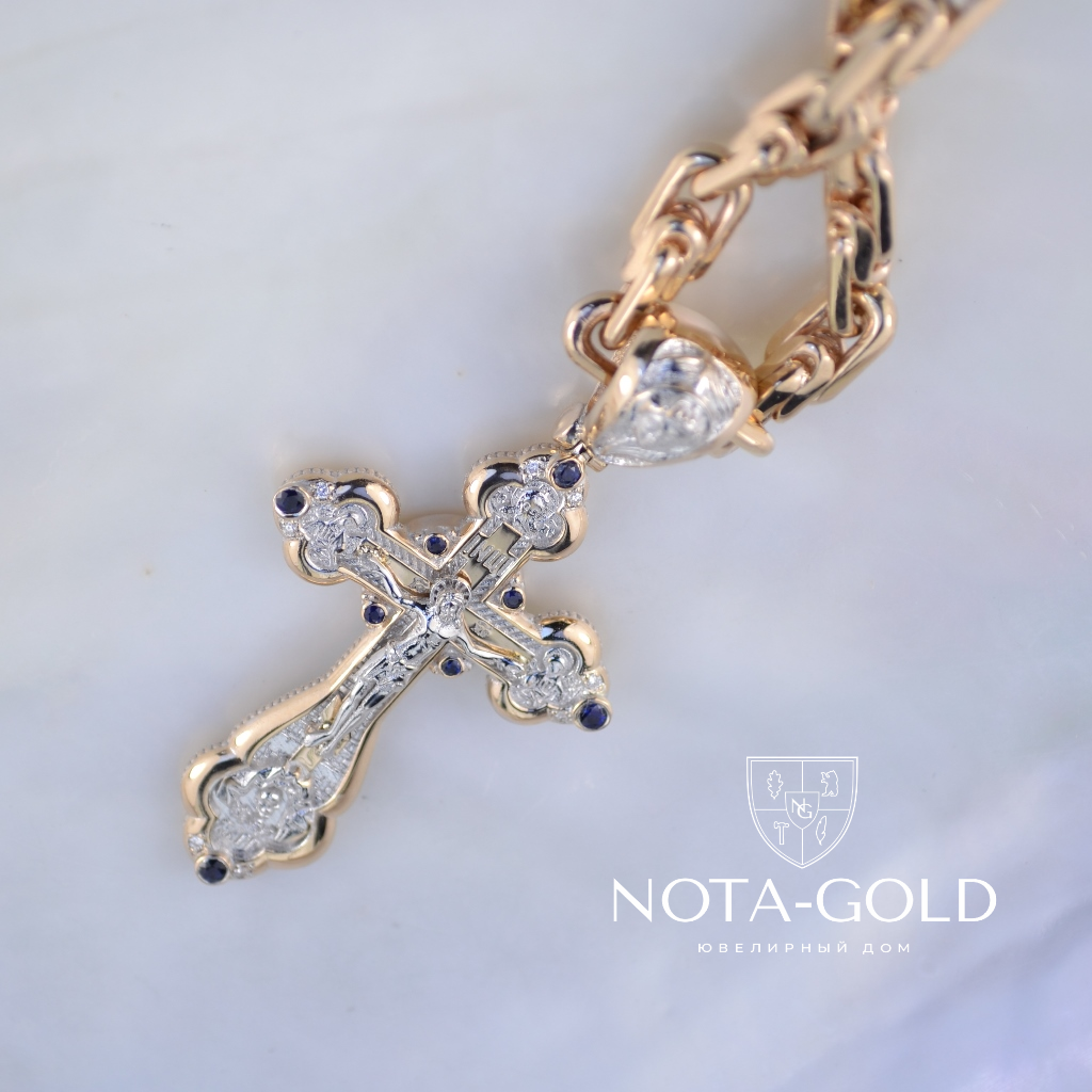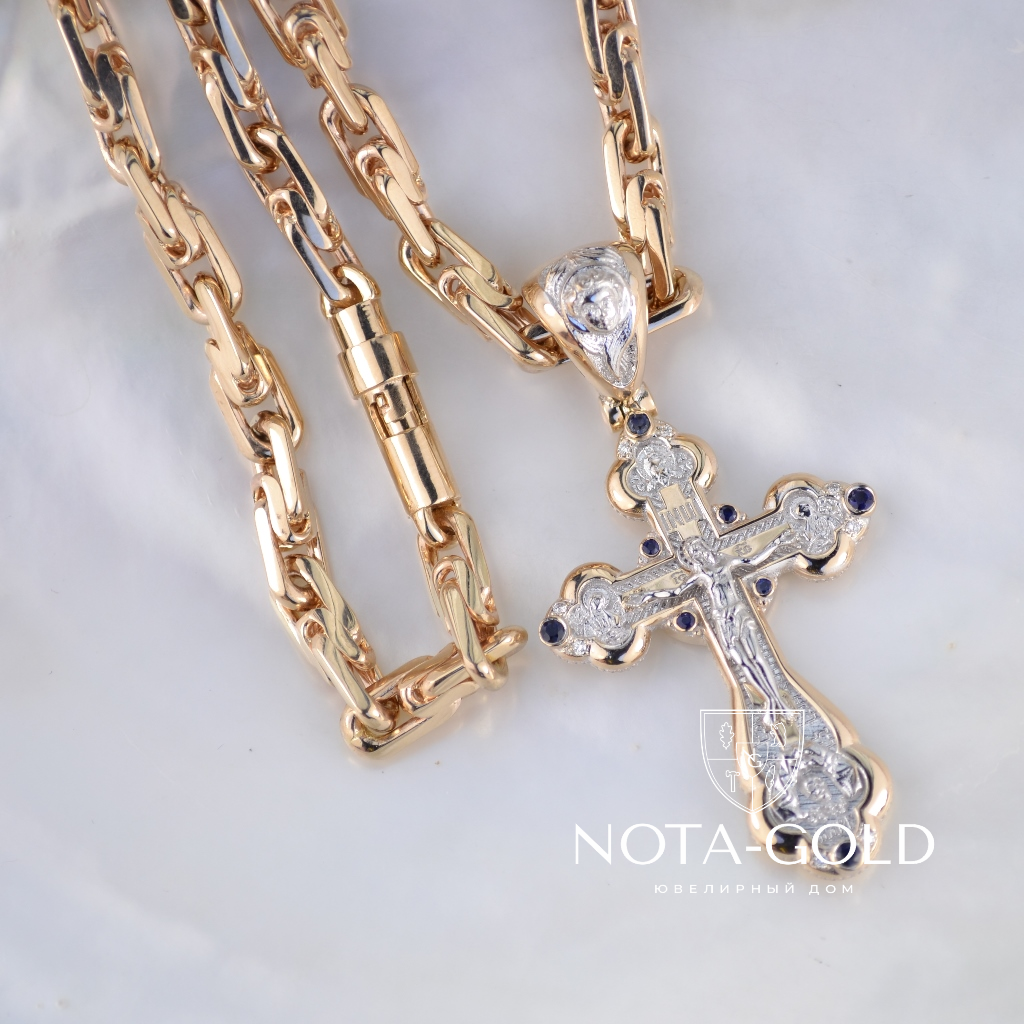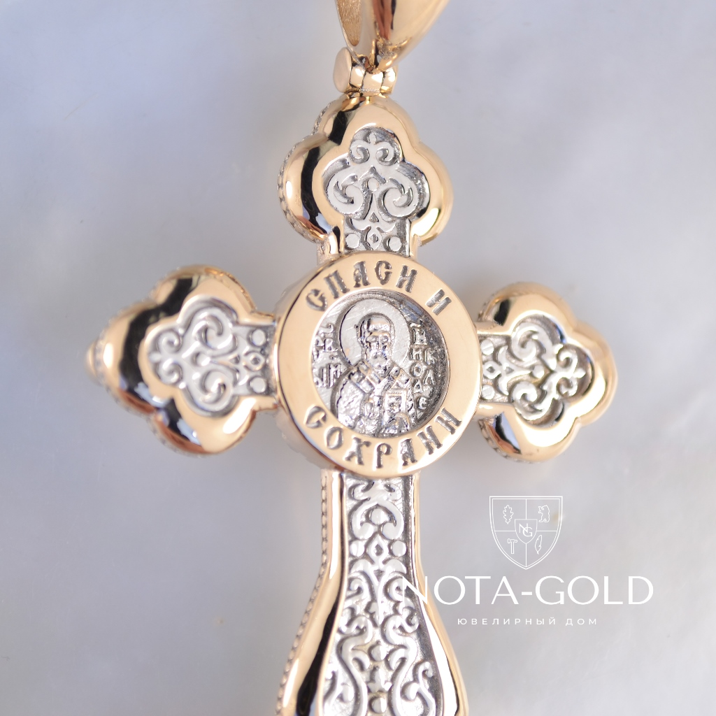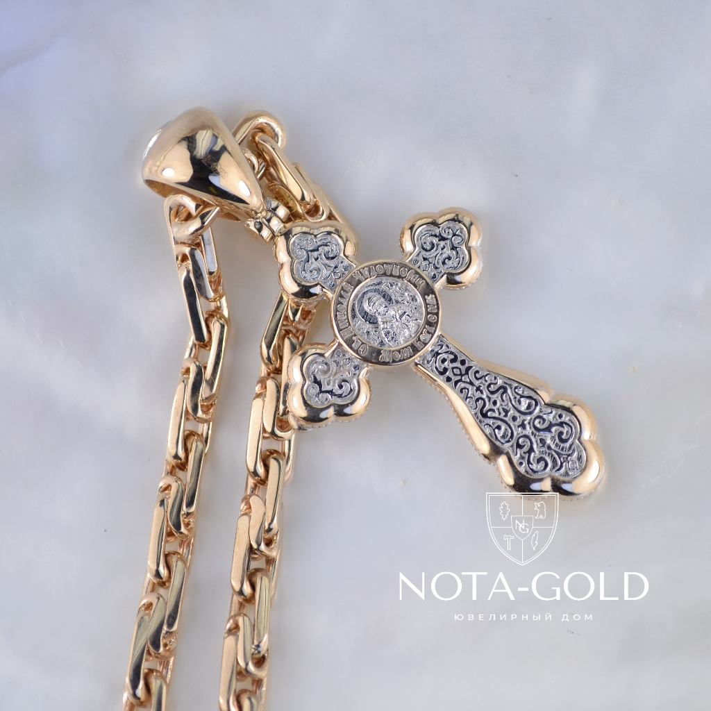 Серебряный крест с позолотой Распятие Иисуса Христа и лик Божья Матерь с цветными фианитами (Вес: 12 гр.)