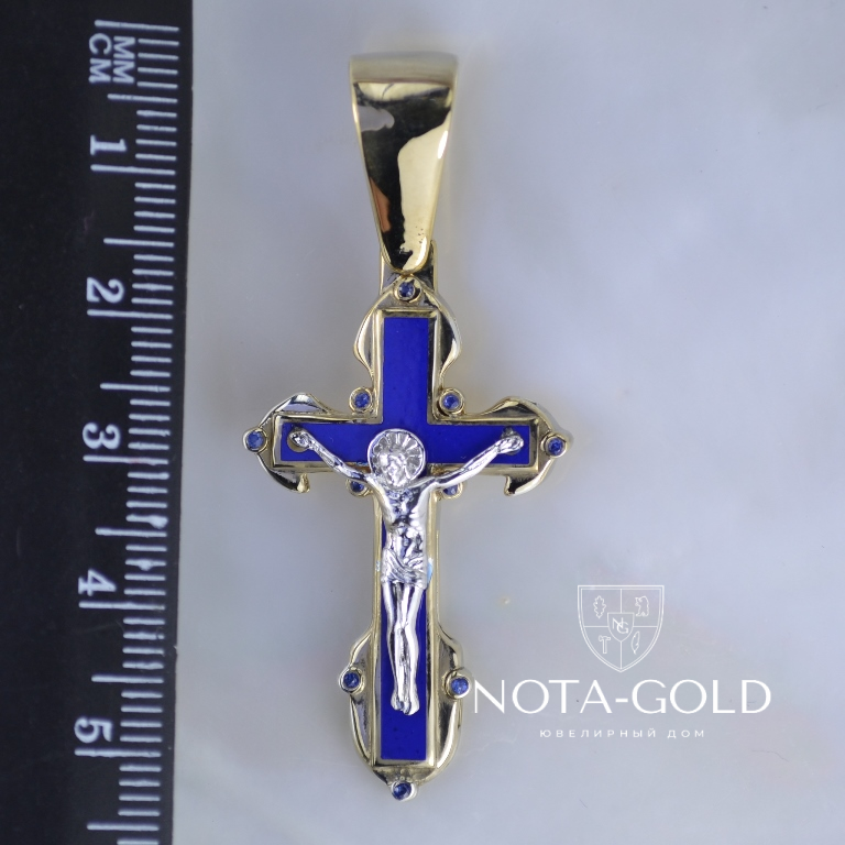 Крестик из позолоченного серебра с синей эмалью и фианитами (Вес: 7 гр.)