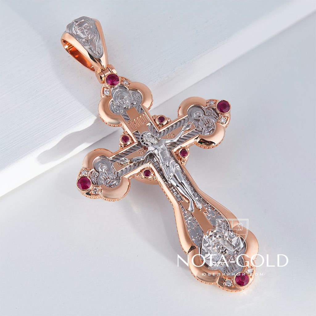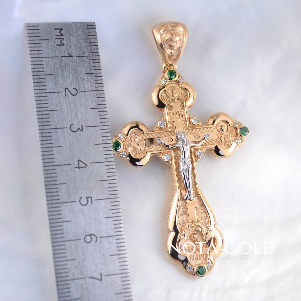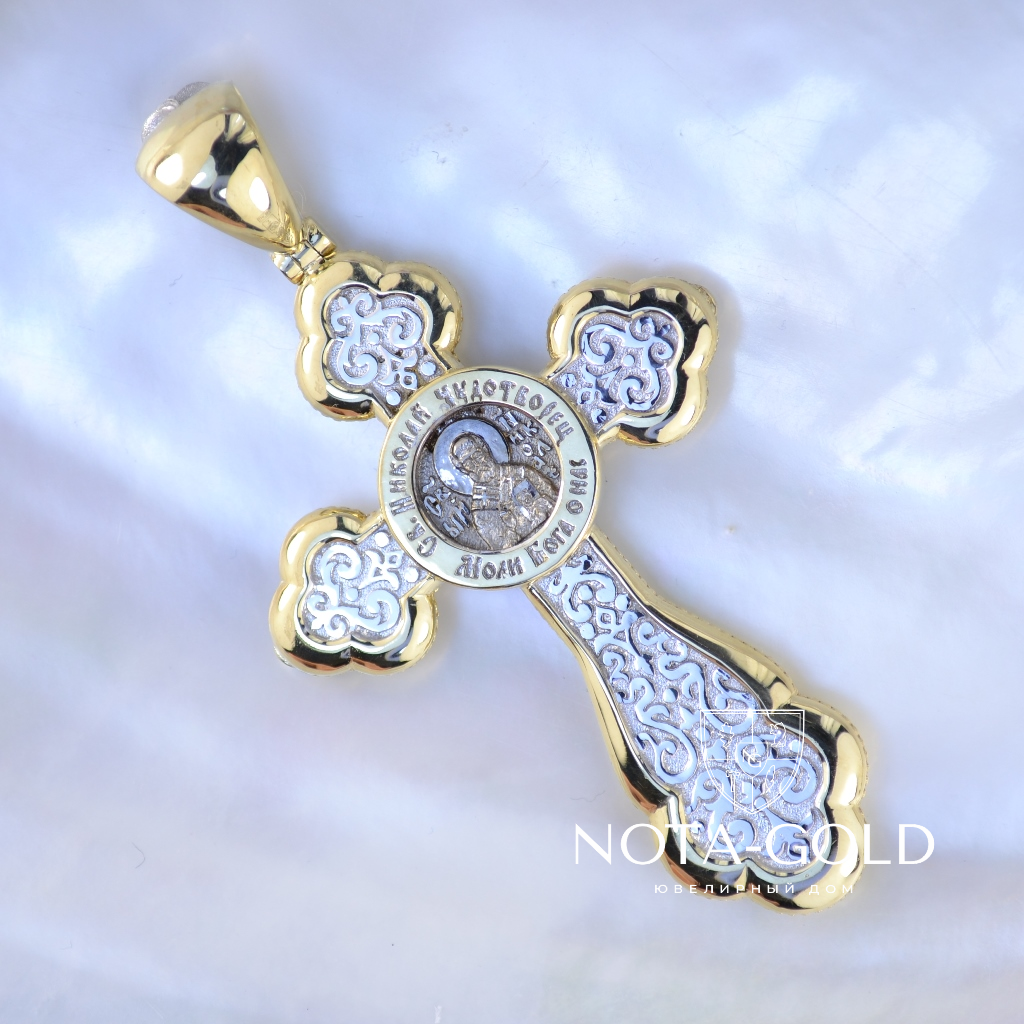 Позолоченный серебряный мужской крест с фианитами эксклюзивного дизайна Распятие Иисуса Христа и лик Николай Чудотворец (Вес: 25 гр.)