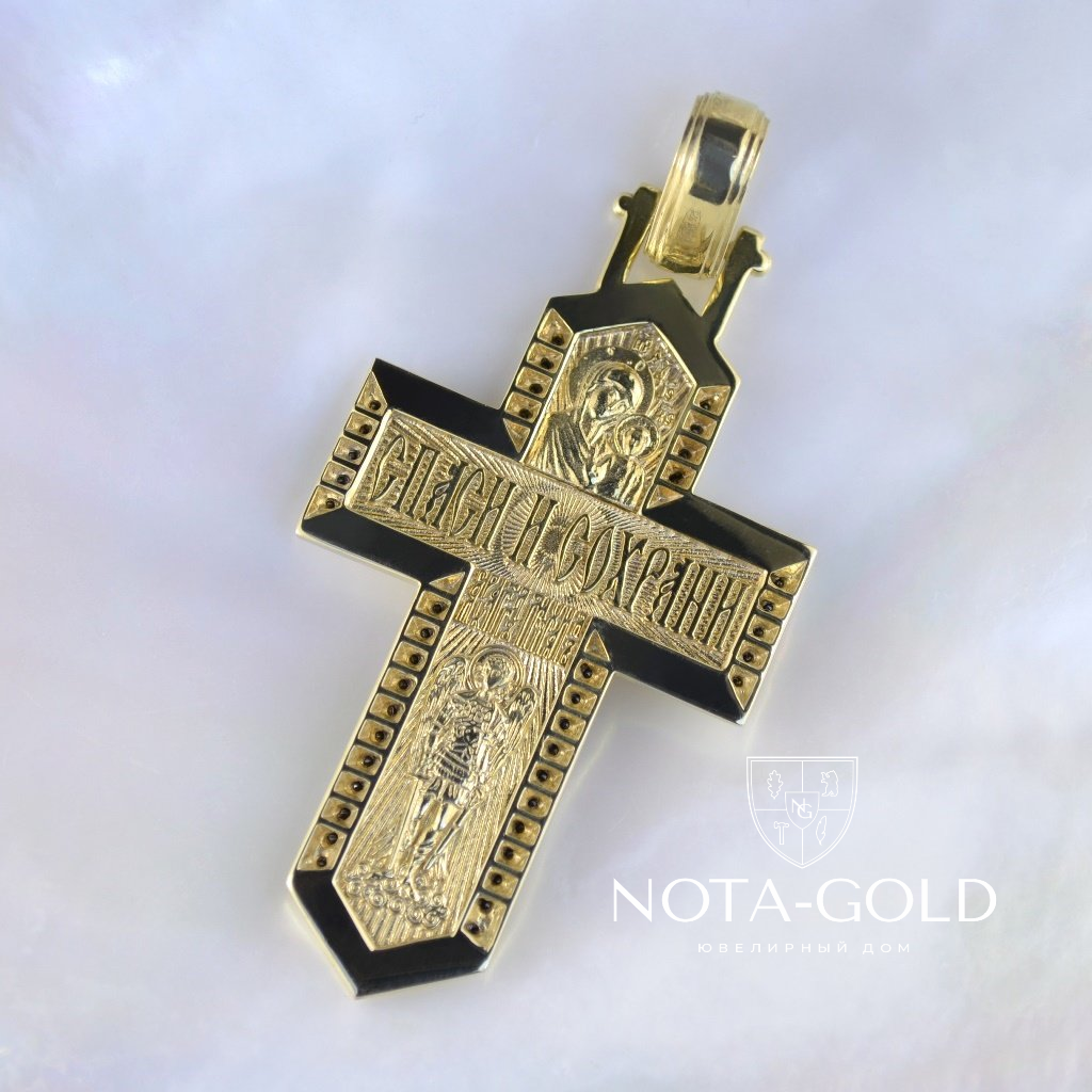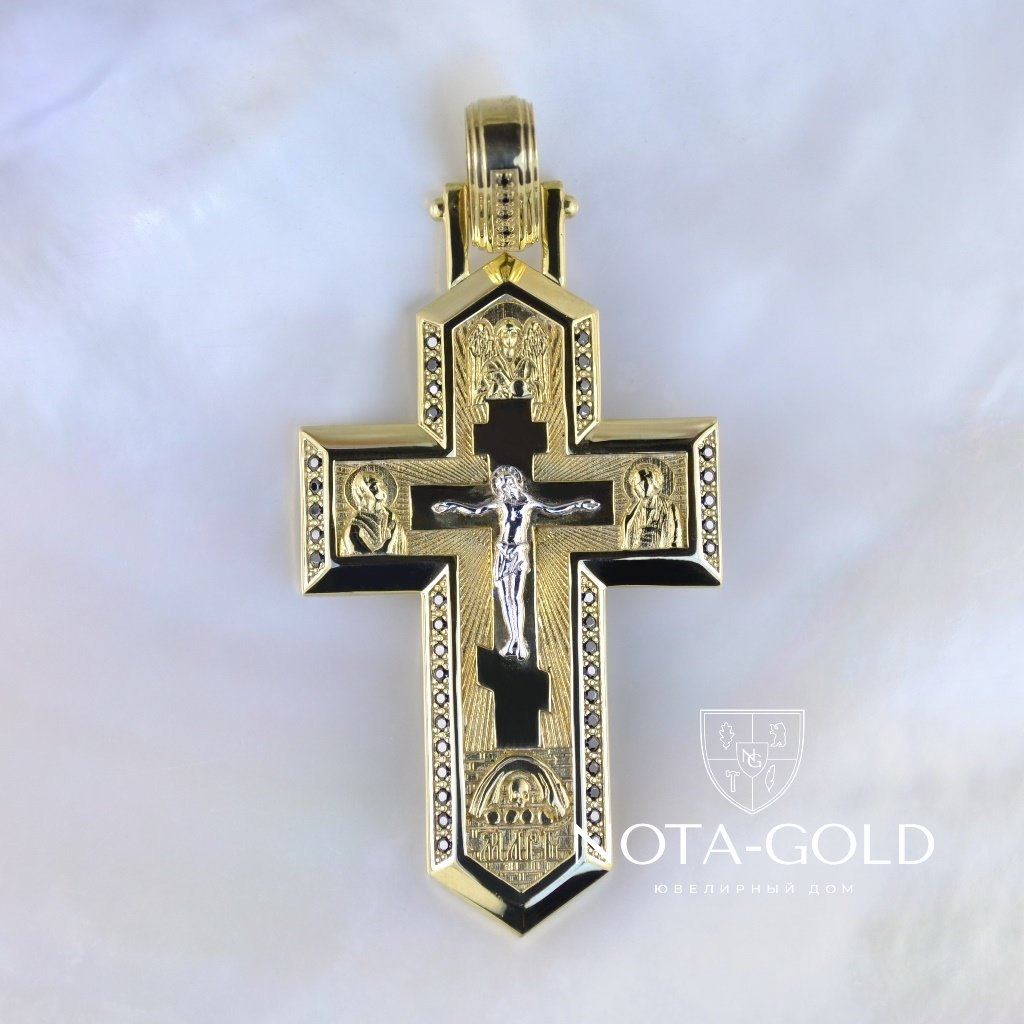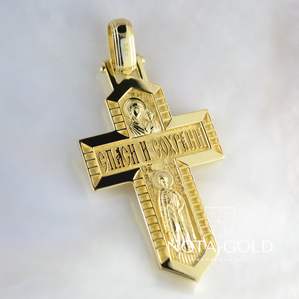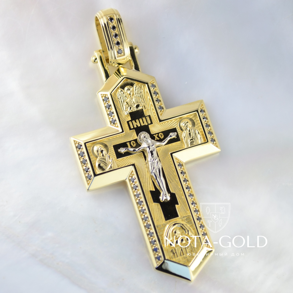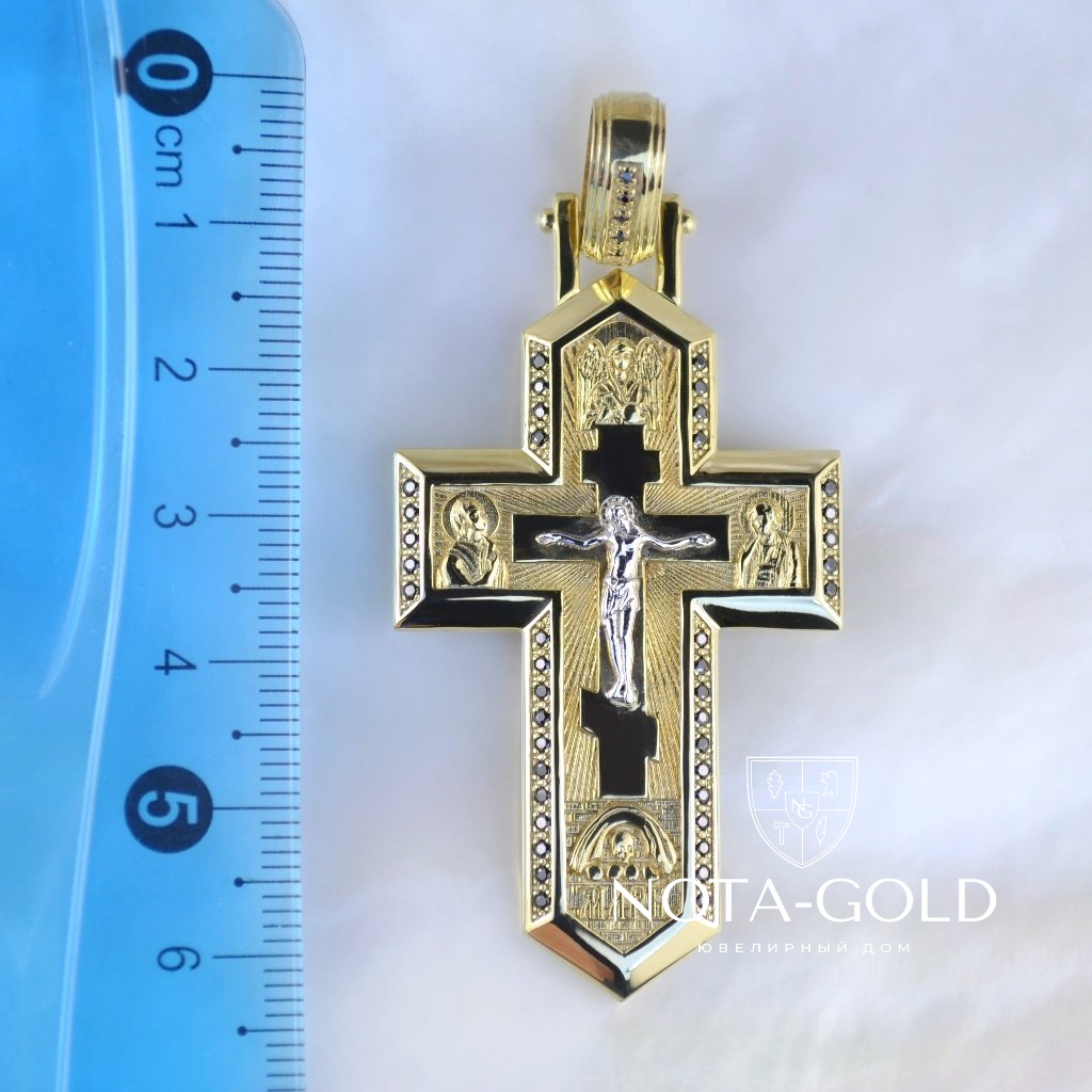 Серебряный позолоченный крест ручной работы с распятием, ликами святых, фианитами и гравировкой (Вес 17 гр.)