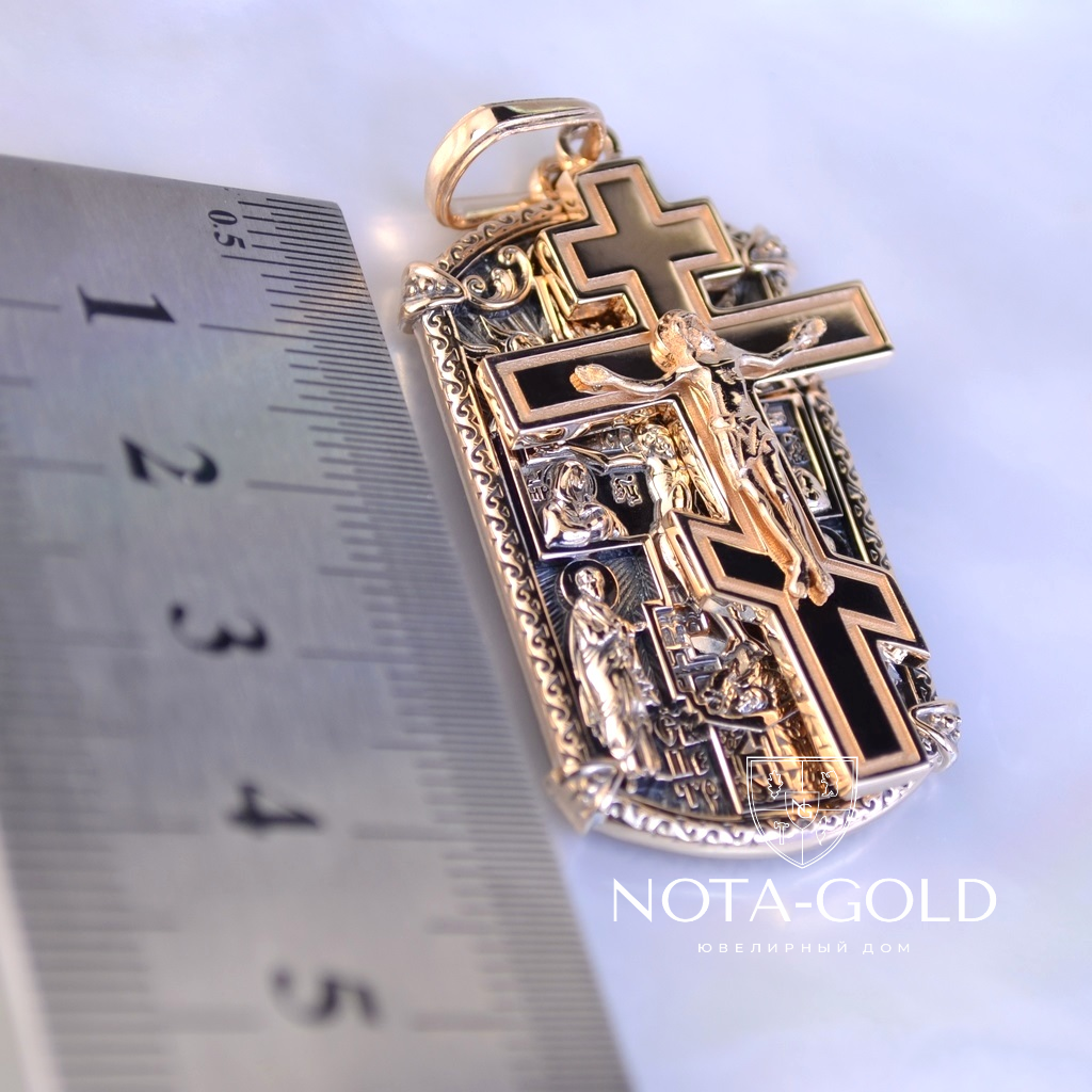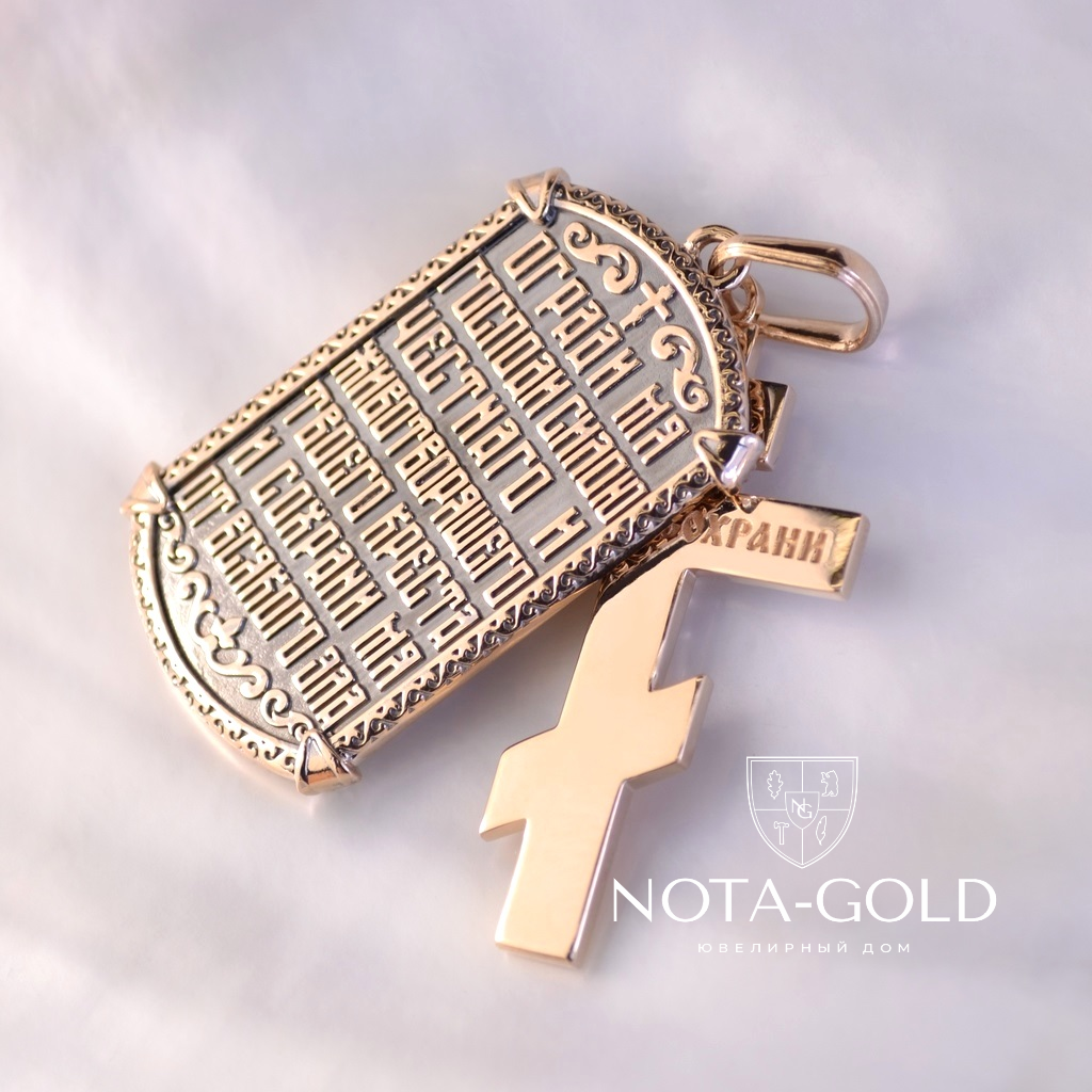 Позолоченный серебряный крест с распятием и жетон-иконка с ликами святых и гравировкой молитвы (Вес: 18 гр.)