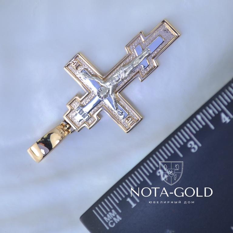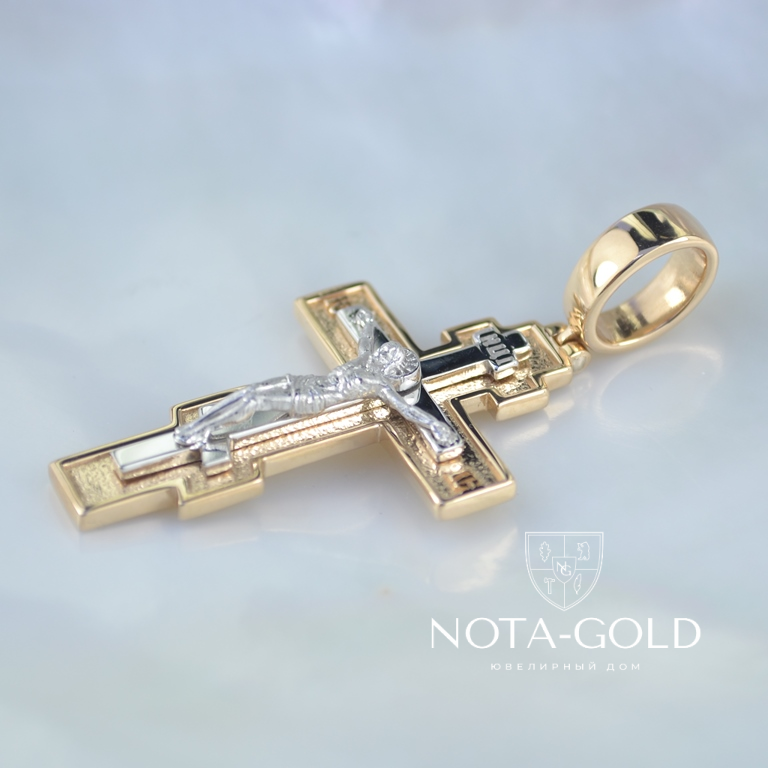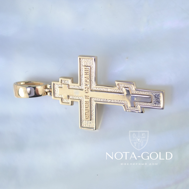 Малый мужской серебряный позолоченный крестик двухцветный с гравировкой Спаси и Сохрани (Вес 7 гр.)