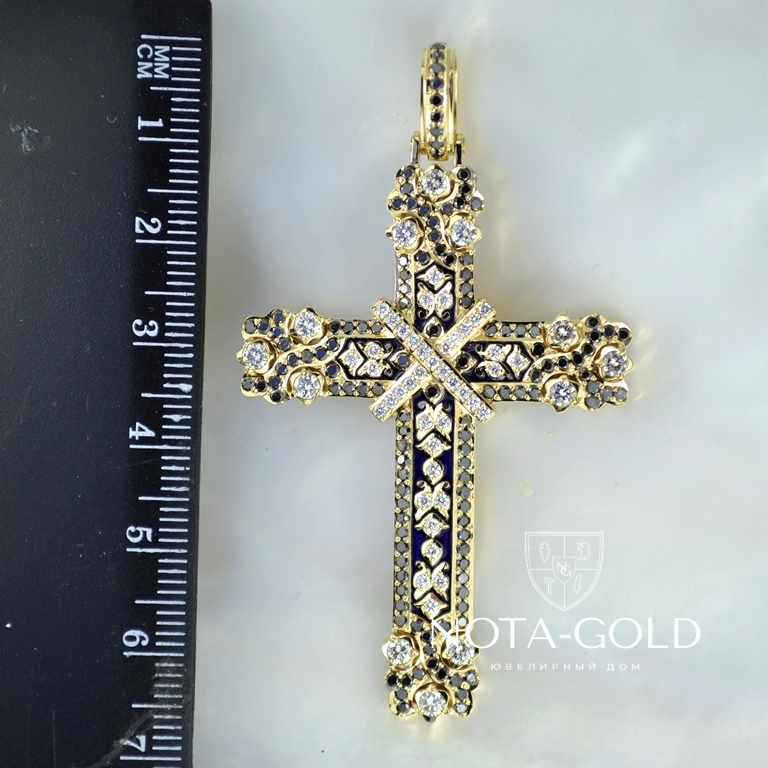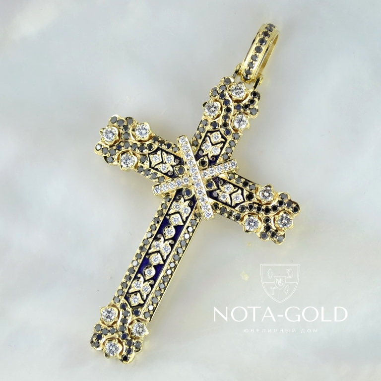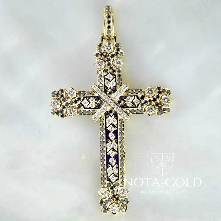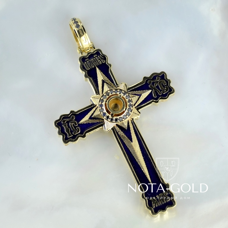 Эксклюзивный большой мужской крест СИЯНИЕ ДУХА из позолоченного серебра с фианитами и синей эмалью (Вес: 18 гр.)
