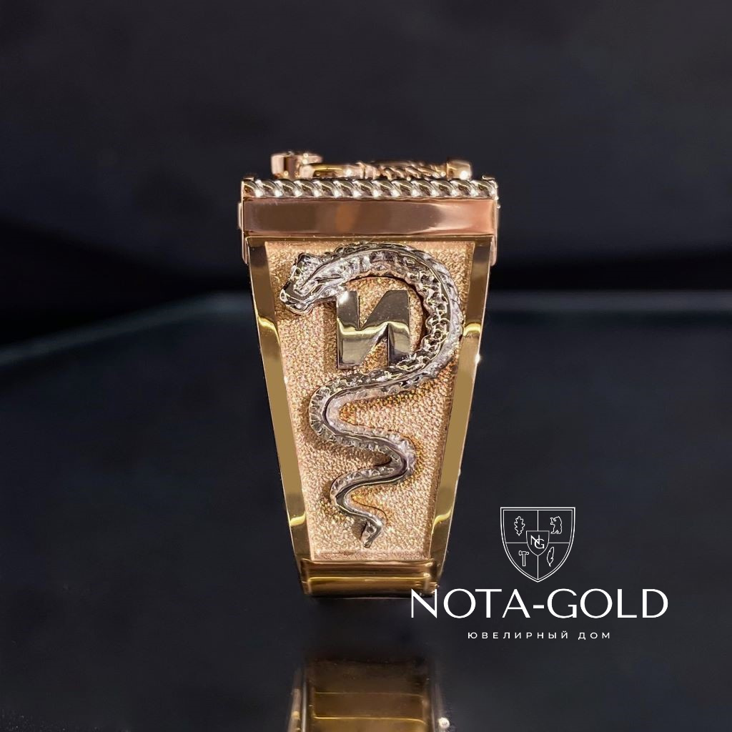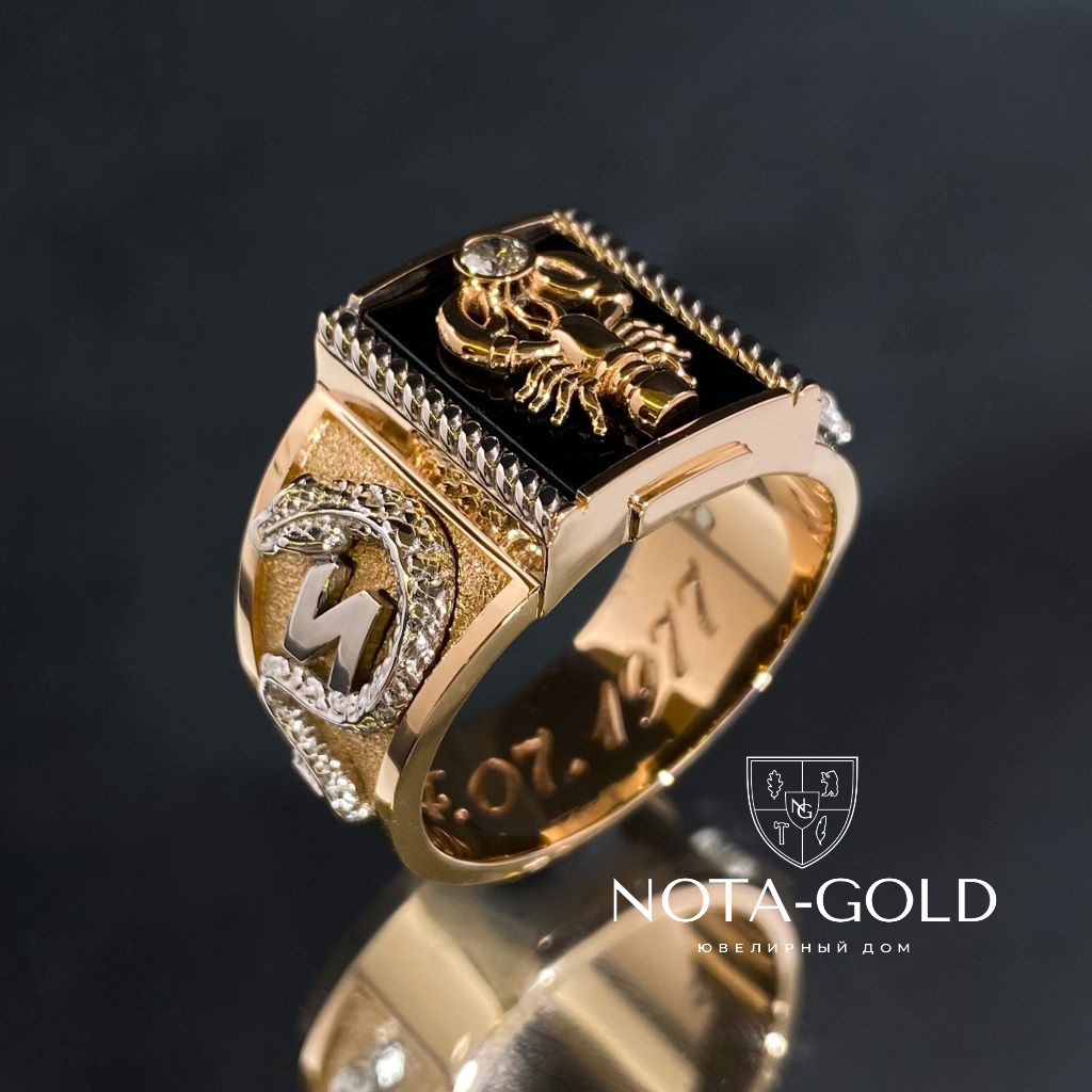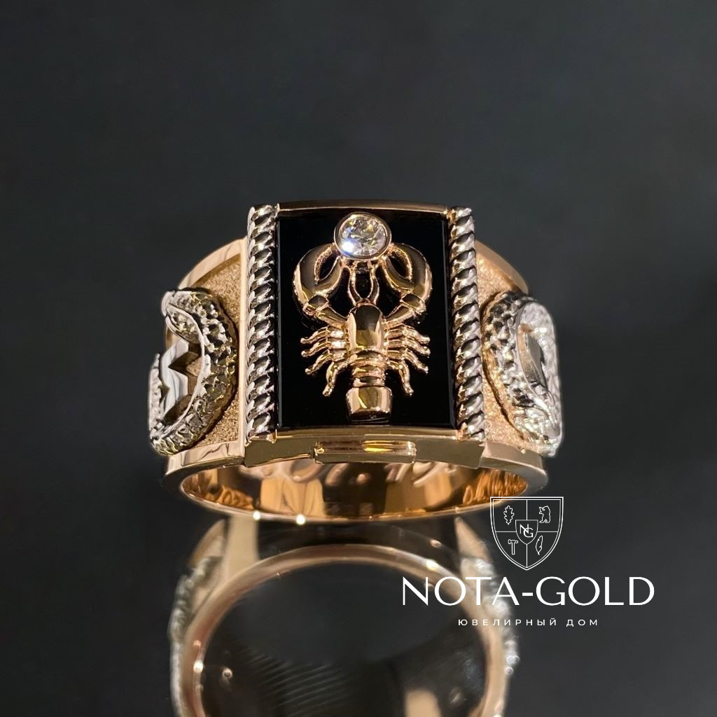 Крупная печатка с символикой и гравировкой из красного и белого золота с бриллиантом и агатом (Вес 27,5 гр.)