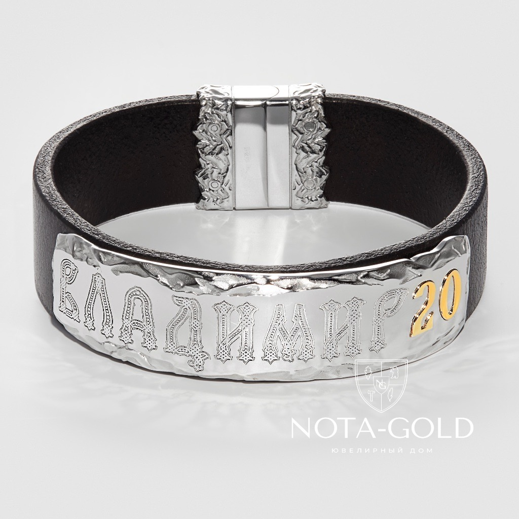 Мужской кожаный браслет с золотыми вставками и гравировкой (Вес 58 гр.)