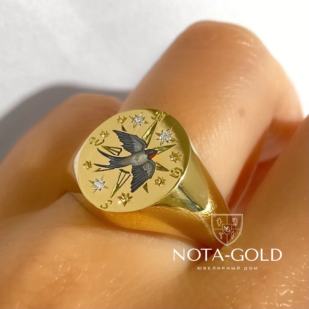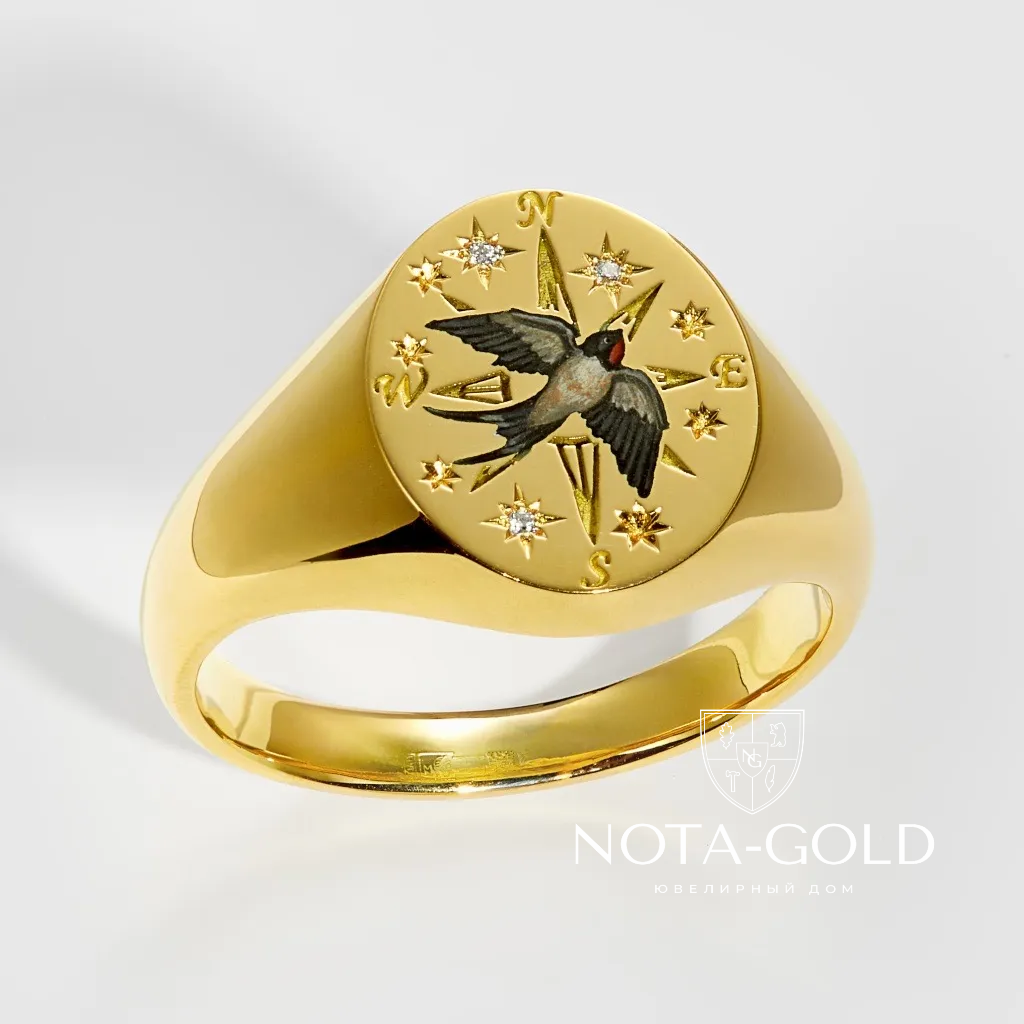 Женское кольцо печатка Ласточка из желтого золота с бриллиантами и эмалью (Вес 20,6 гр.)