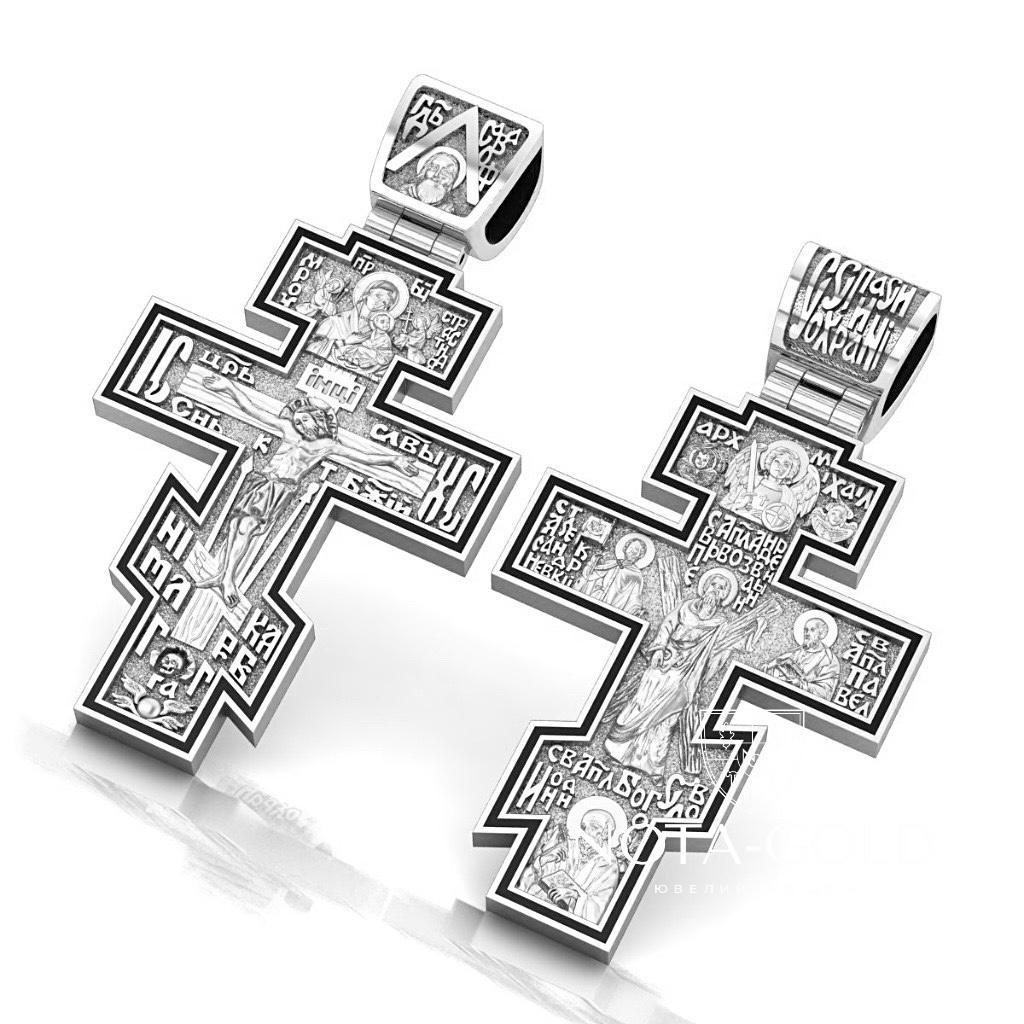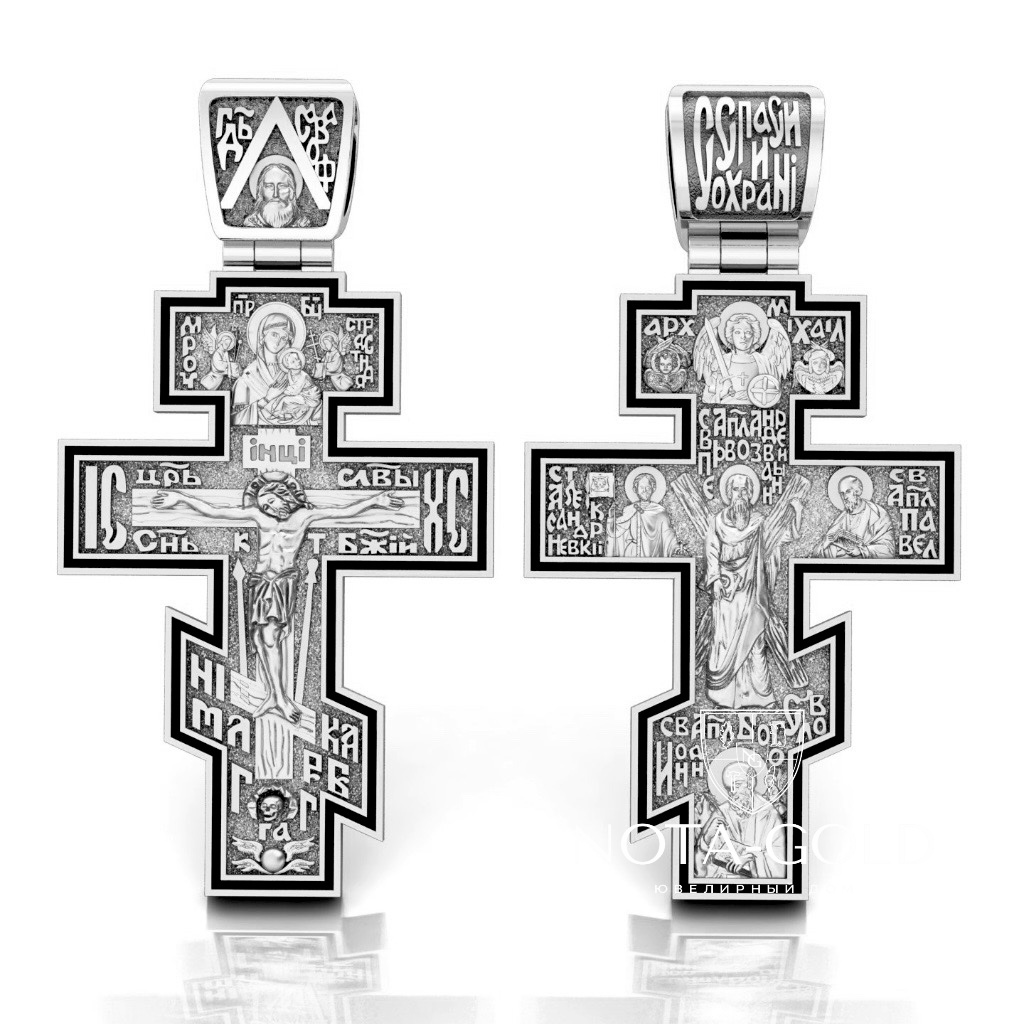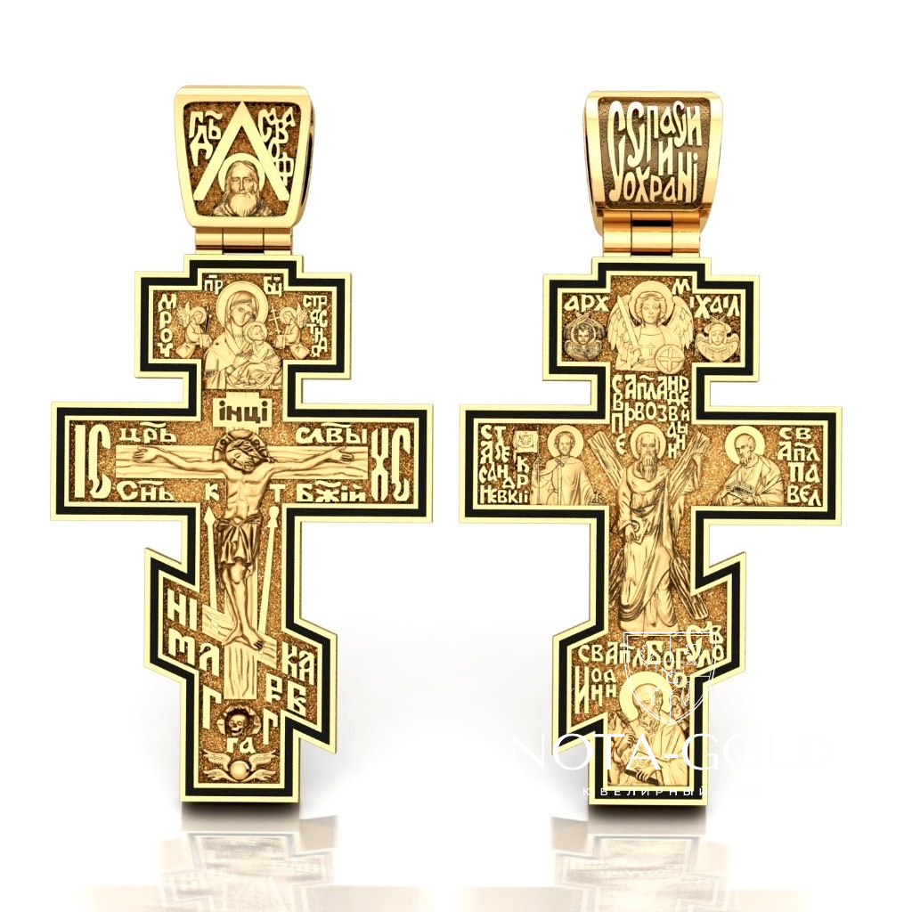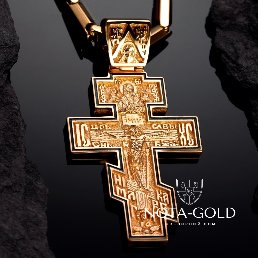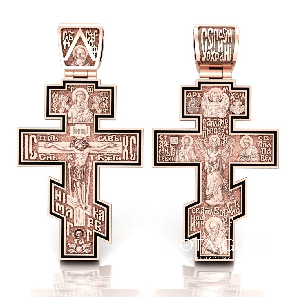 Крест возможно заказать в желтом, розовом или белом золоте. С черной эмалью.