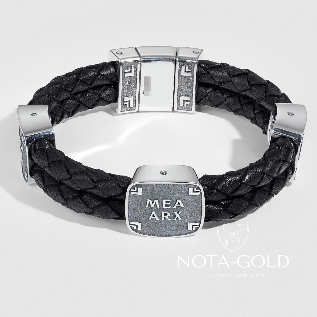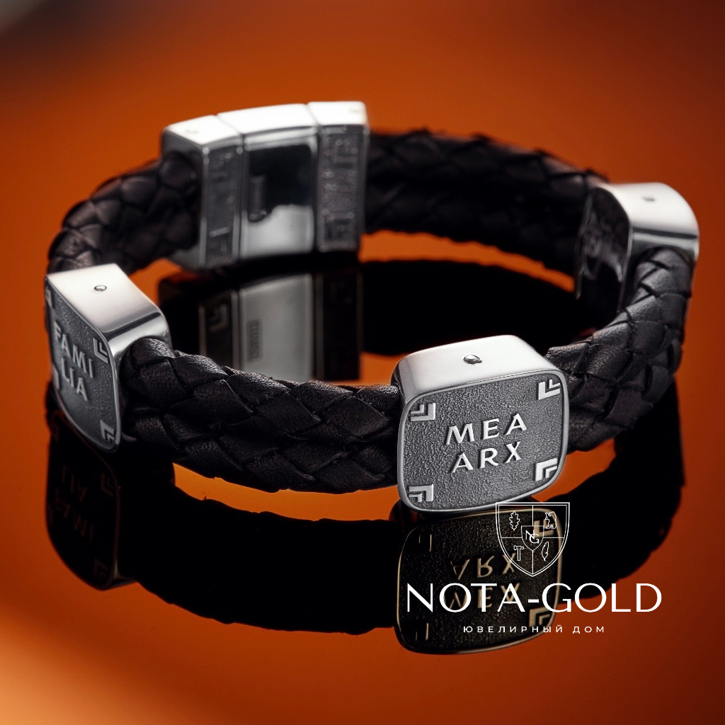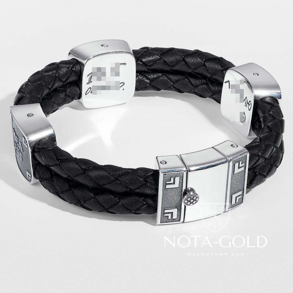 Кожаный браслет Моя Семья с серебряными вставками и гравировкой (Вес 54,7 гр.)