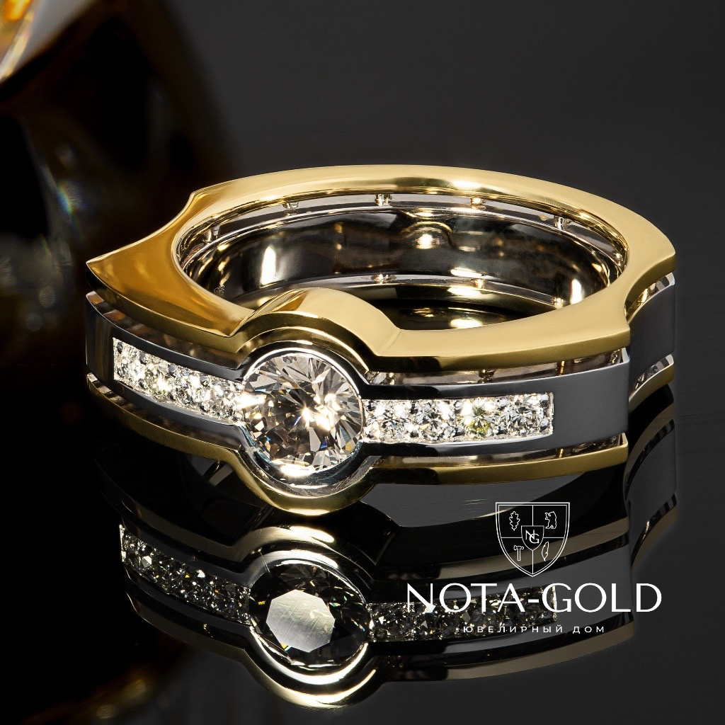 Кольцо с вырезами из желтого и белого золота с крупным центральным бриллиантом (Вес 10 гр.)