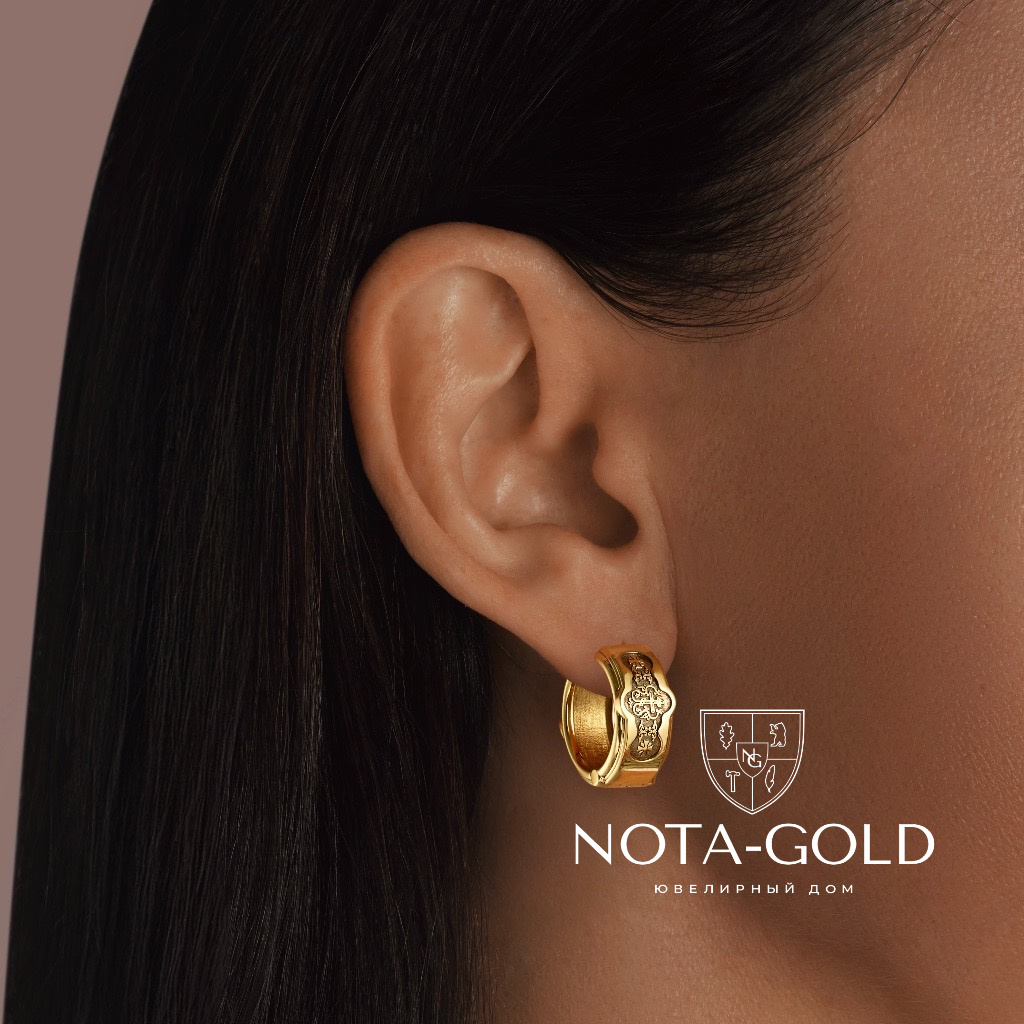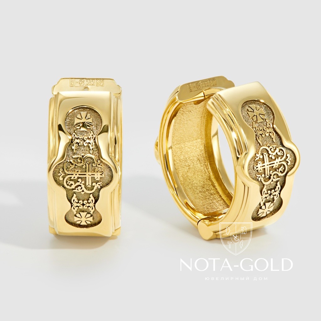 Широкие женские серьги кольца из желтого золота с православной символикой (Вес 14,5 гр.)