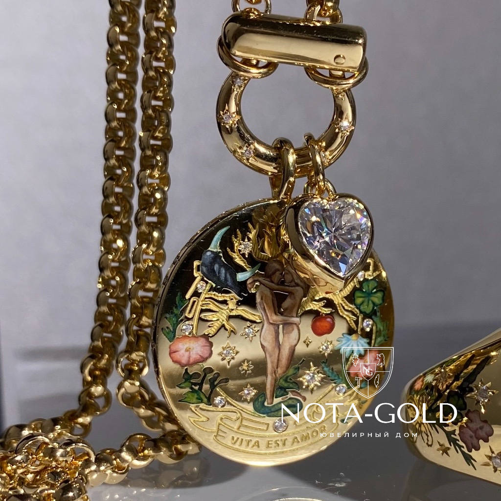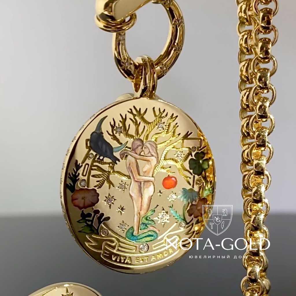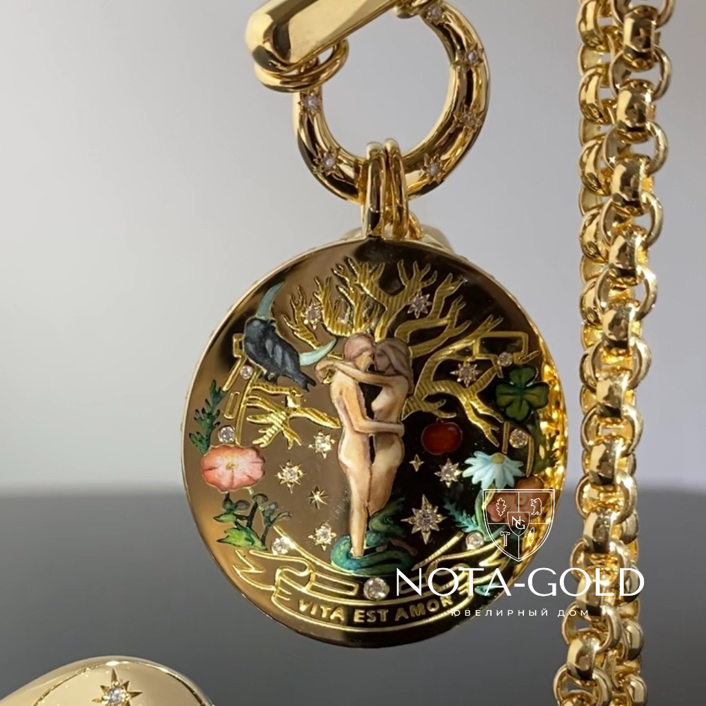 Золотая подвеска Vita Est Amor с бриллиантами гравировкой и эмалью (Вес 30 гр.)