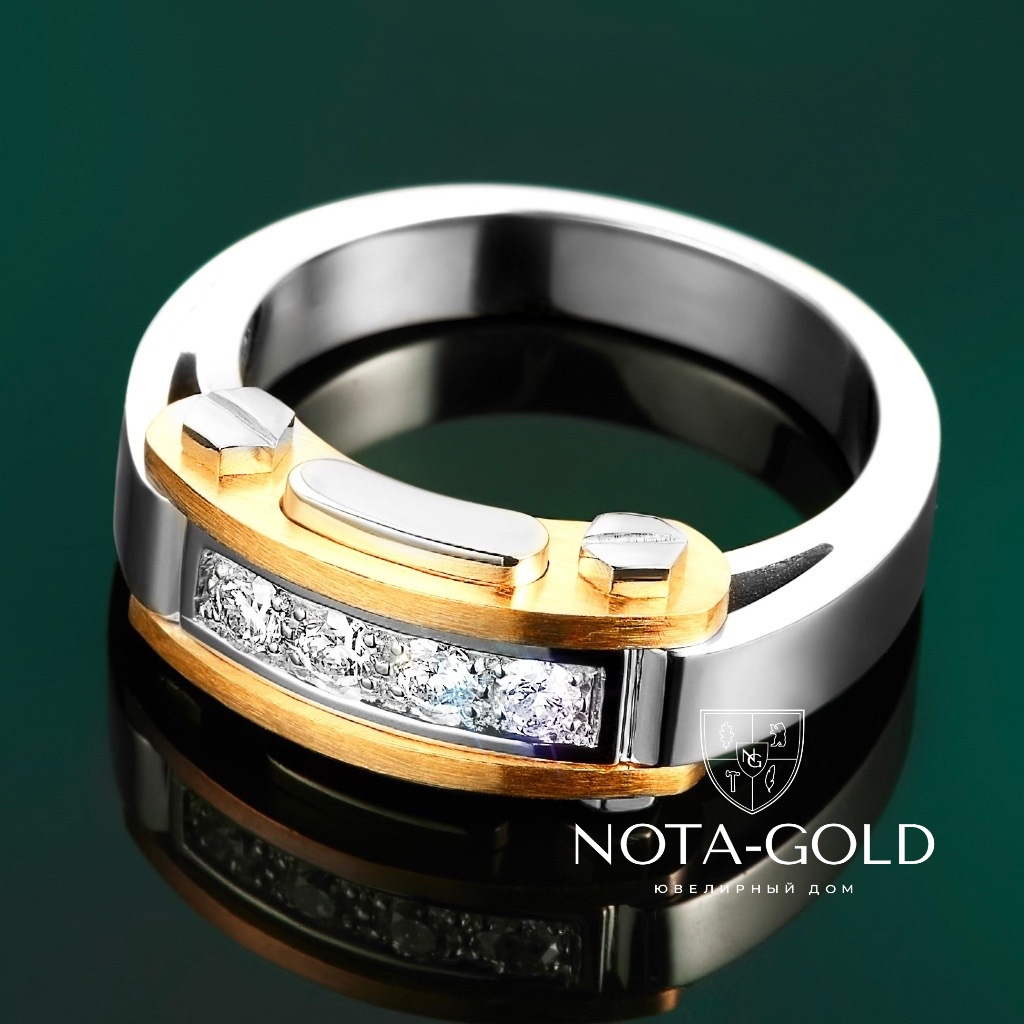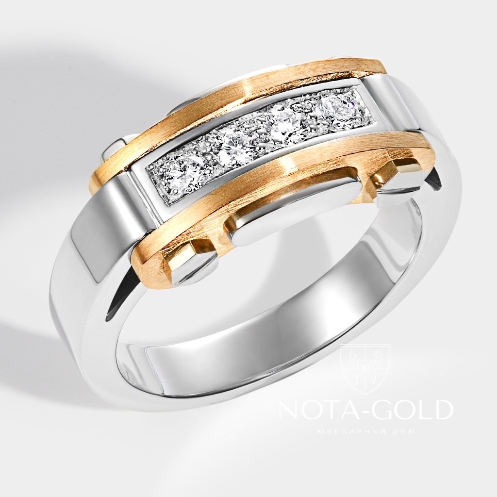 Мужское кольцо из двух видов золота с четырьмя бриллиантами (Вес 14 гр.)