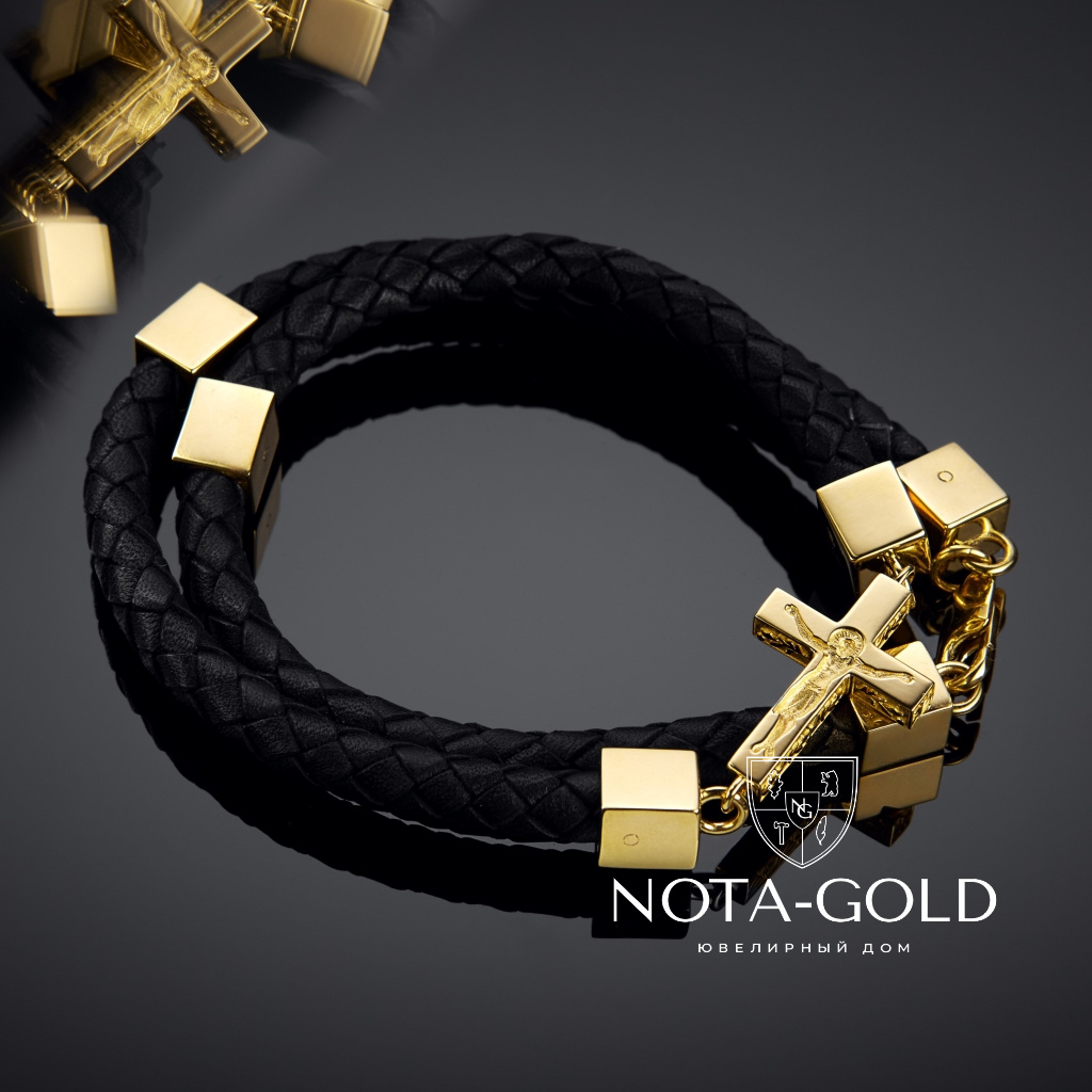 Кожаный плетёный двухоборотный браслет с крестом и вставками из желтого золота (Вес 39,5 гр.)