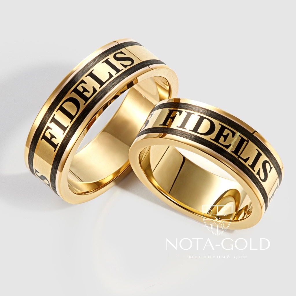 Обручальные кольца из желтого золота с черным карбоном, эмалью и гравировкой (Вес пары 14 гр.)