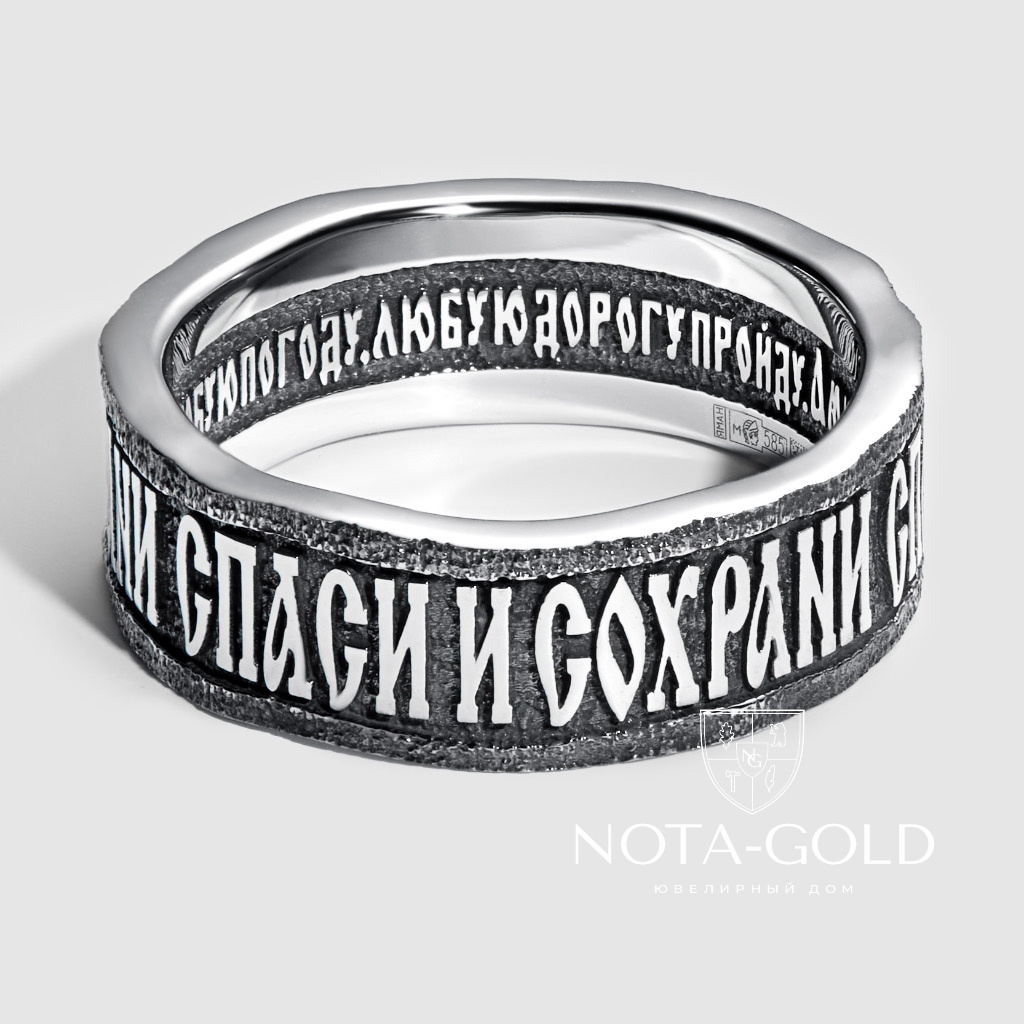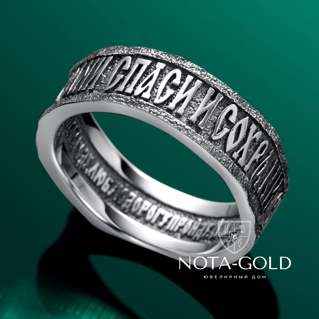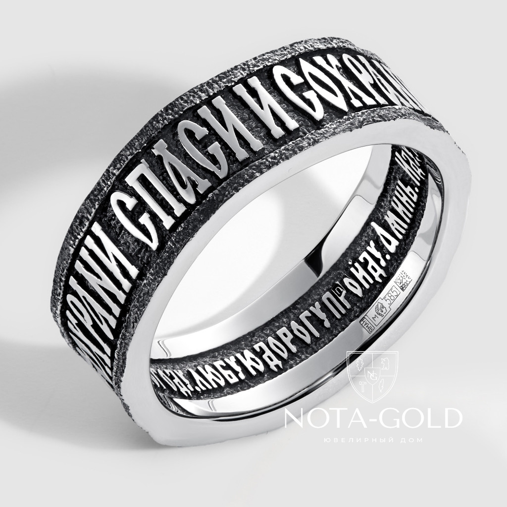 Кольцо с молитвой Спаси и Сохрани из белого золота с фактурной поверхностью (Вес 10 гр.)