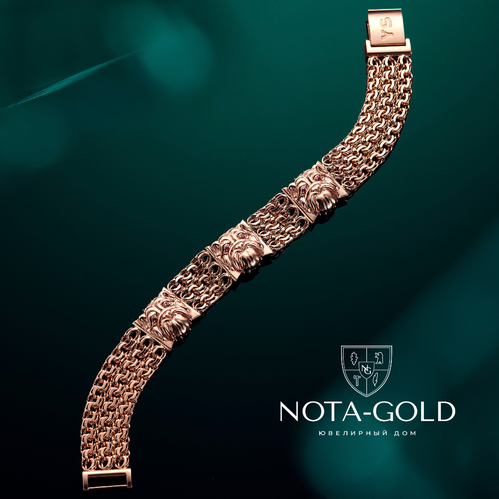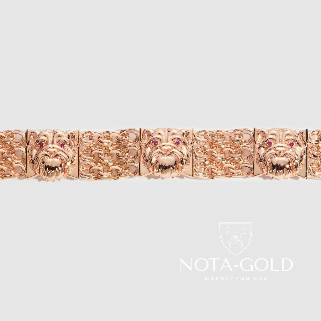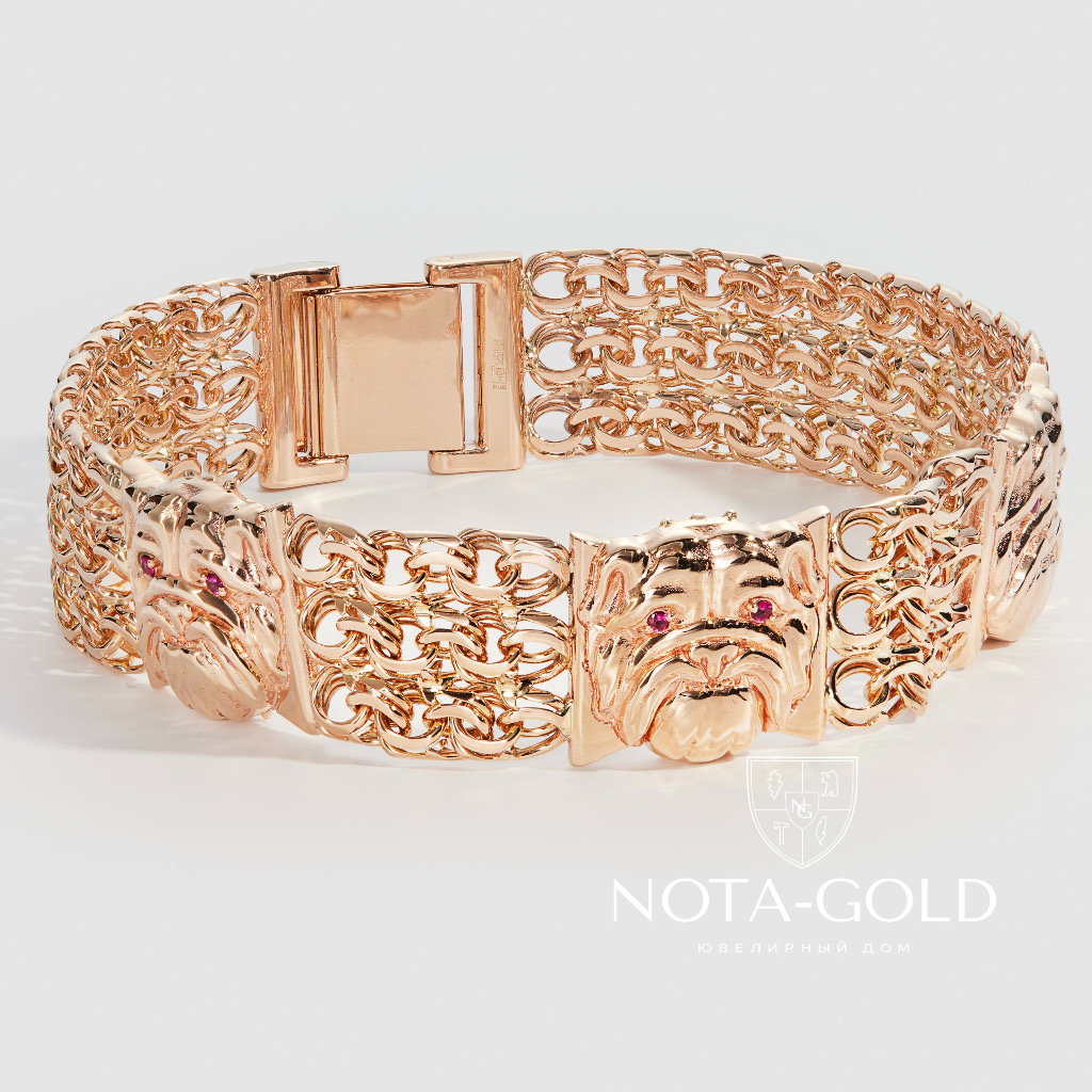 Широкий золотой браслет плетения Бисмарк со вставками бульдоги с рубинами (Вес 65,3 гр.)