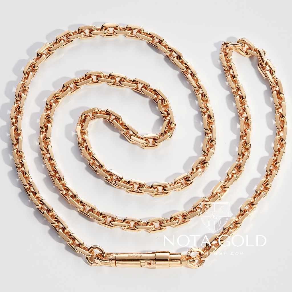 Цепочка плетения Якорь обточенный уголком изготавливается на заказ по Вашим индивидуальным параметрам (вес, длина, ширина). Заказать можно из красного, жёлтого или белого золота 585, либо 750 пробы, может быть изготовлена из материала Мастерской или из золота Заказчика. Цепочку из белого золота можно дополнительно покрыть родием для придания холодного, стального оттенка. Так же, дополнительно, можно почернить золотую цепь Якорь обточенный уголком , что особо подчеркнёт рельеф плетения. Исходя из Ваших предпочтений, мы изготавливаем любой замок из золота: карабин, шпрингель, пенал, коробочка. Все подробности по стоимости и возможности изготовления, Вы можете уточнить у наших менеджеров.