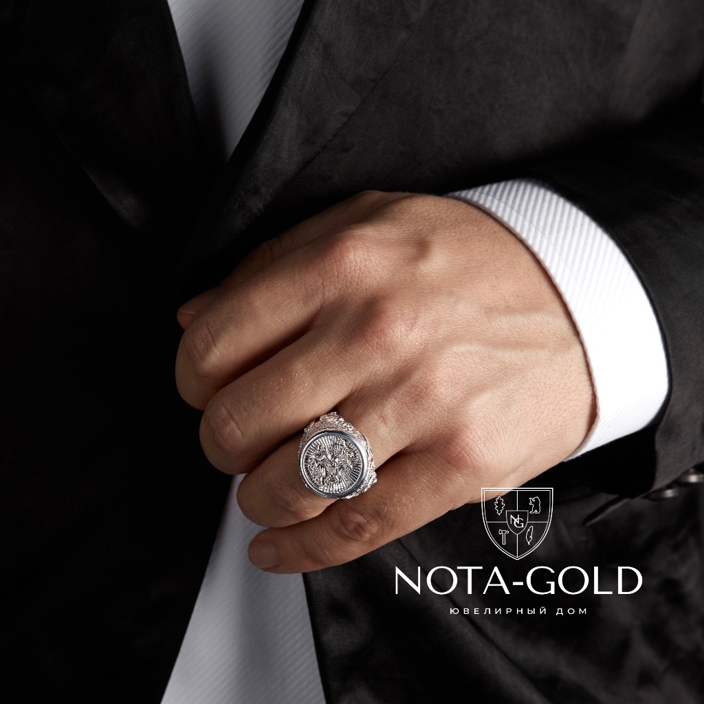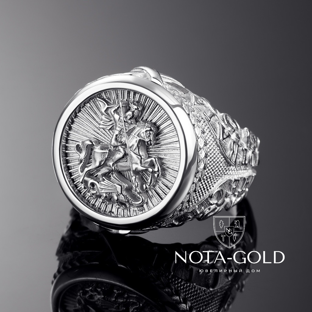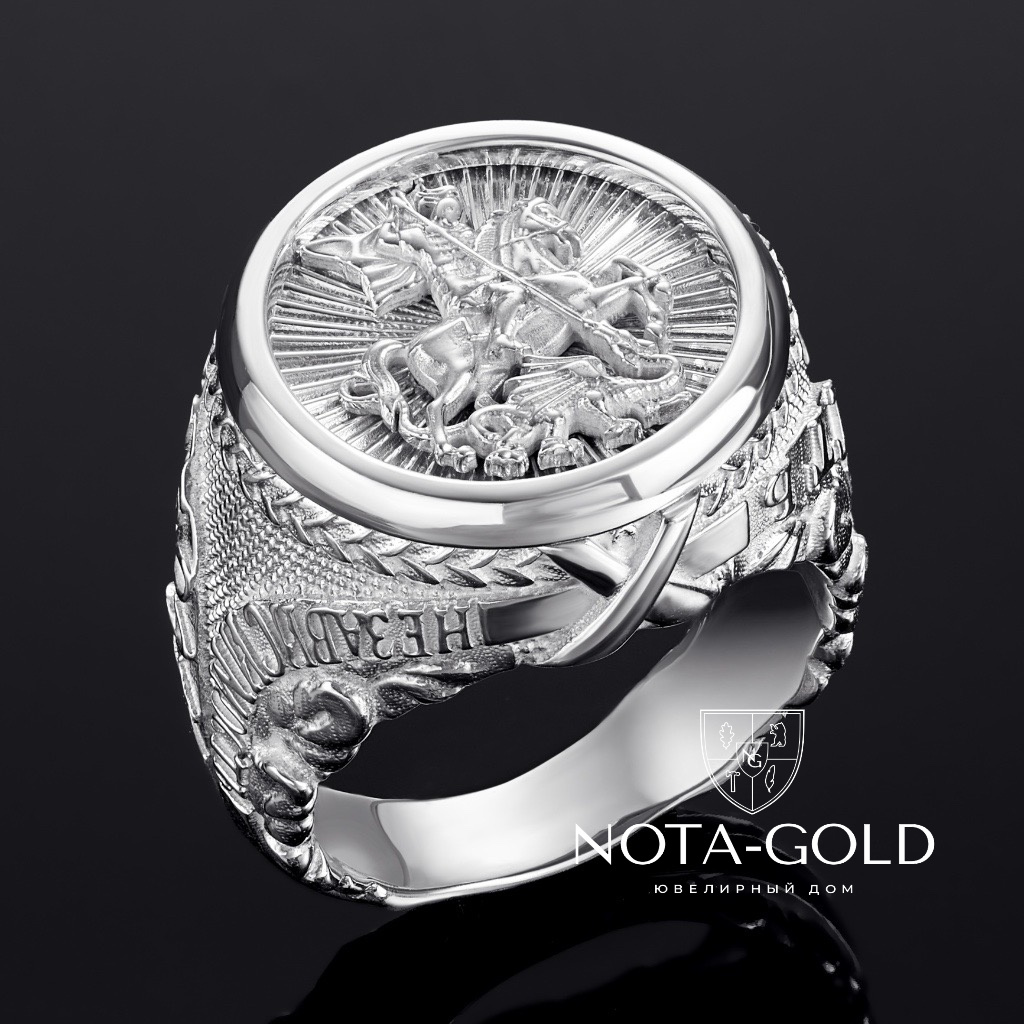 Серебряное мужское кольцо печатка Св. Георгий Победоносец с девизами (Вес 16 гр.)
