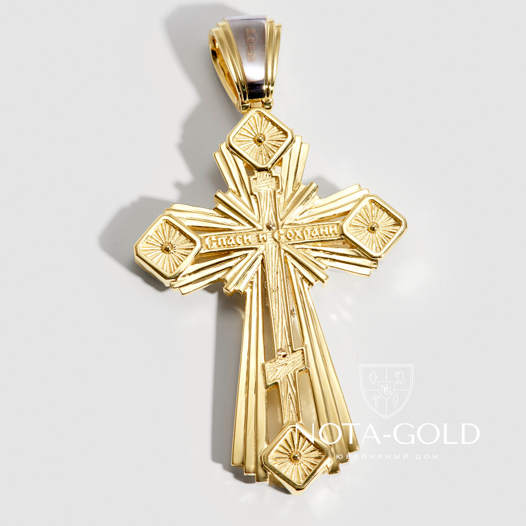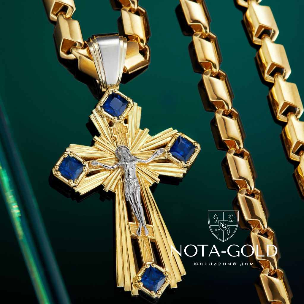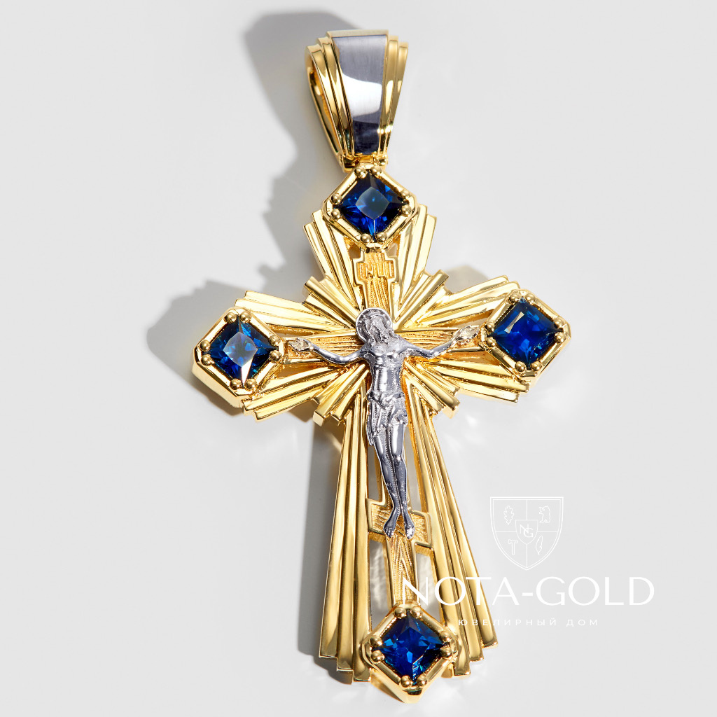 Нательный православный крест из желтого и белого золота с сапфирами (Вес 18 гр.)