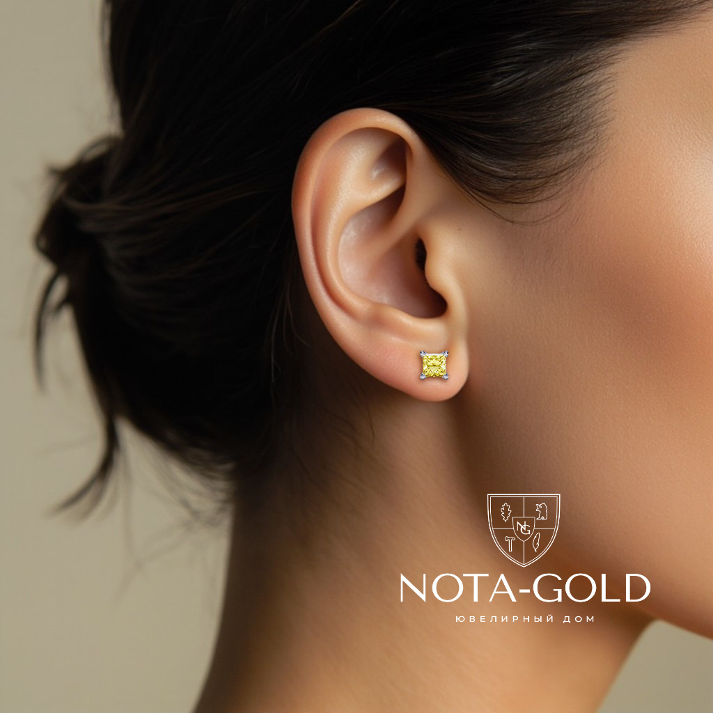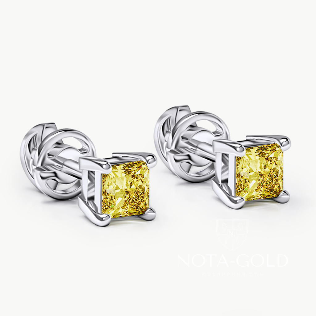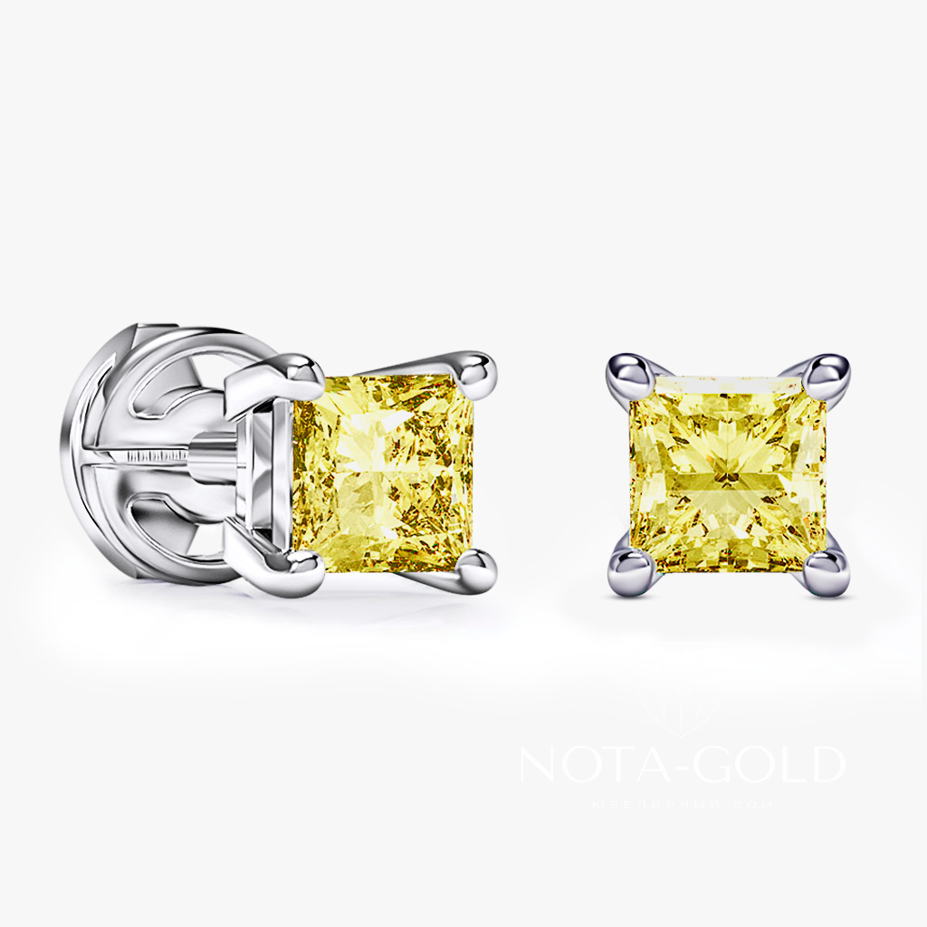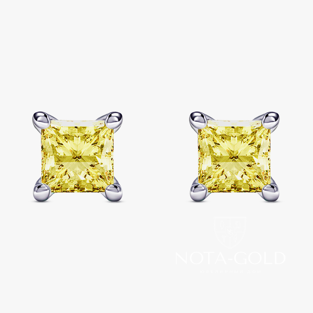 Женские серьги пусеты из белого золота с жёлтыми бриллиантами огранки Принцесса (Вес 1,8 гр.)
