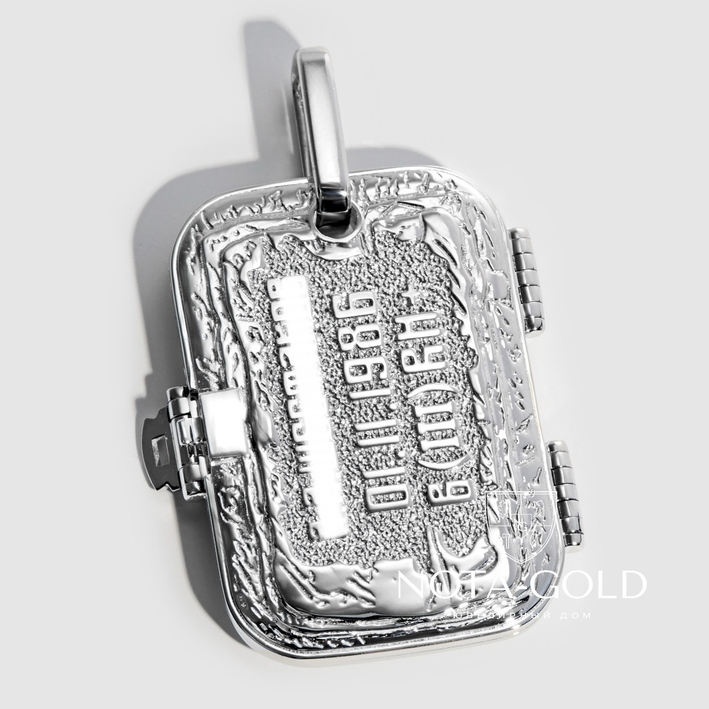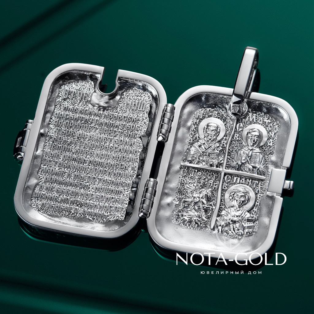 * Левая створка: Выгравирован текст Молитвы (например, "Отче наш" или "Спаси и Сохрани") в мельчайшей детализации.