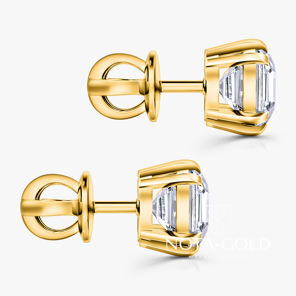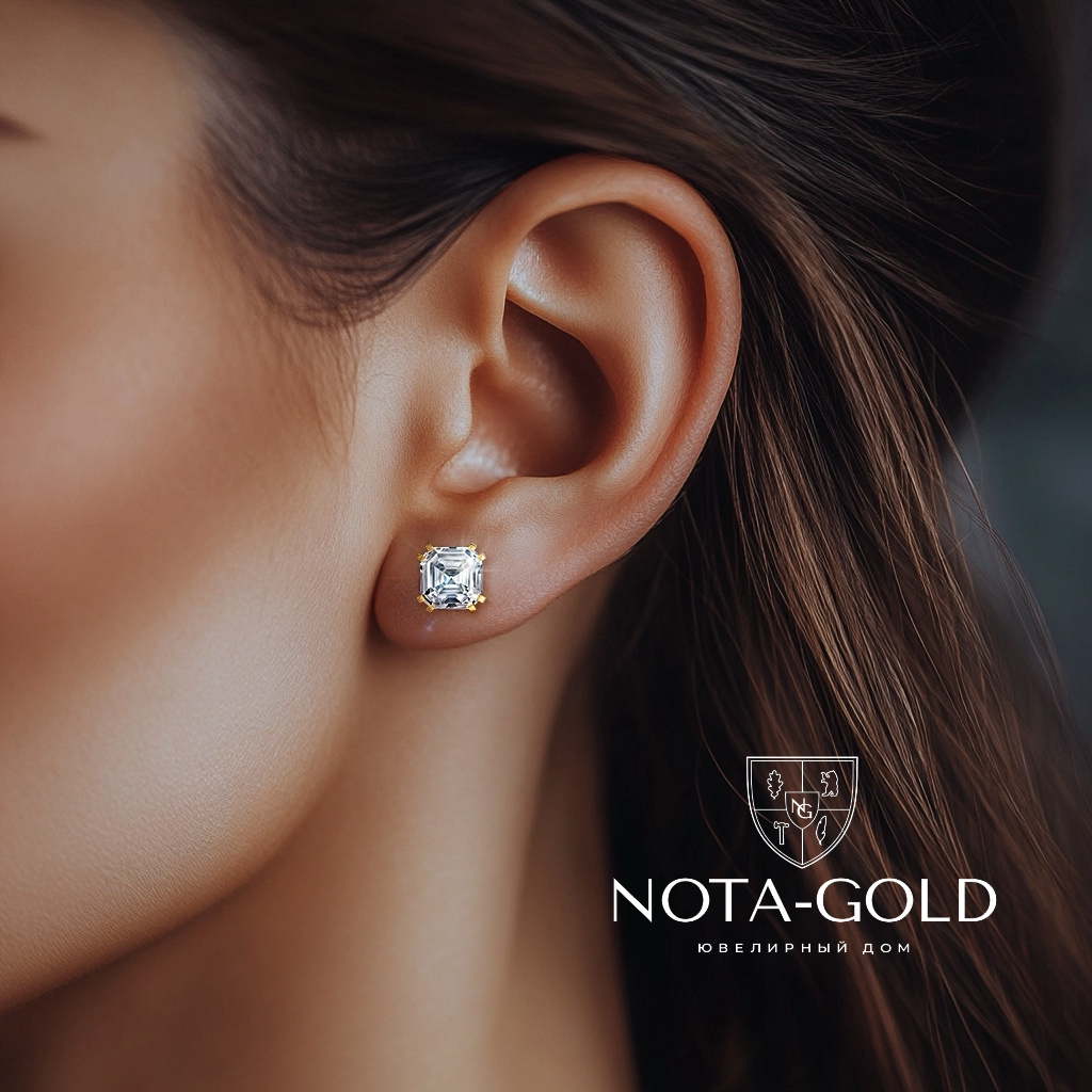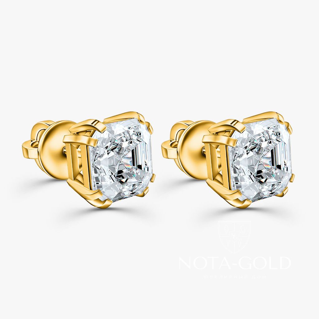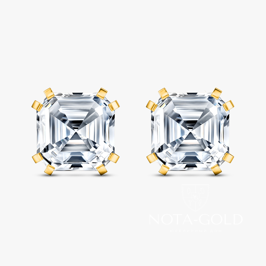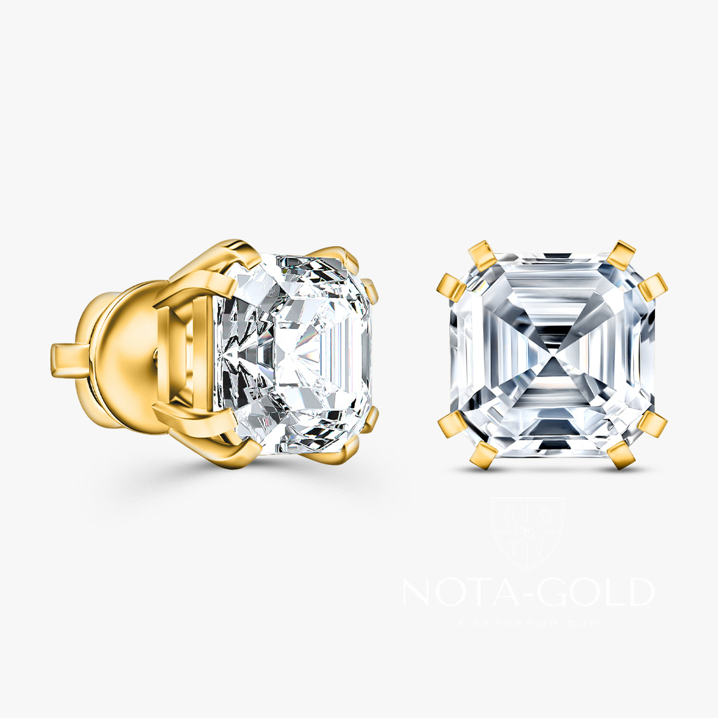 Серьги пусеты из желтого золота с лабораторными бриллиантами огранки Ашер (Вес 3,1 гр.)