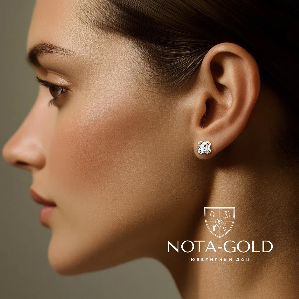 Серьги пусеты из желтого золота с лабораторными бриллиантами огранки Кушон (Вес 1,5 гр.)