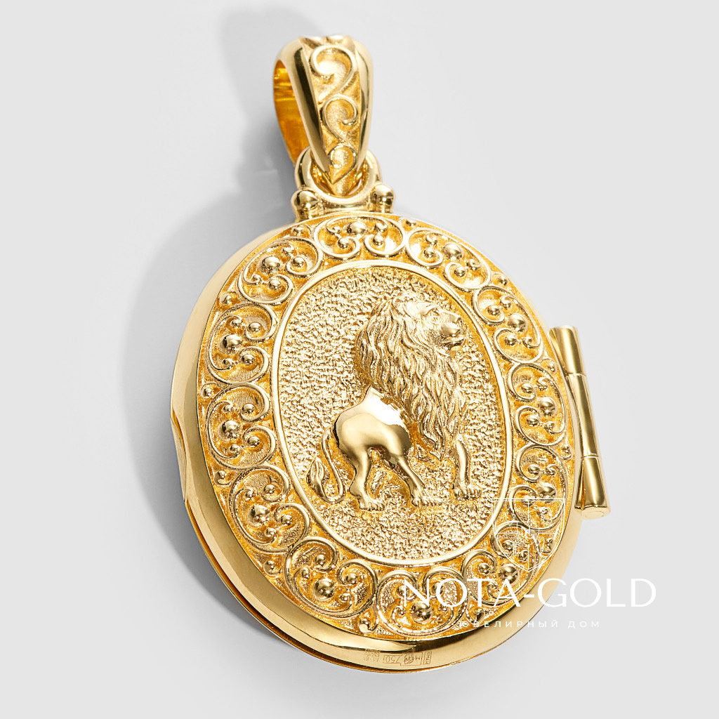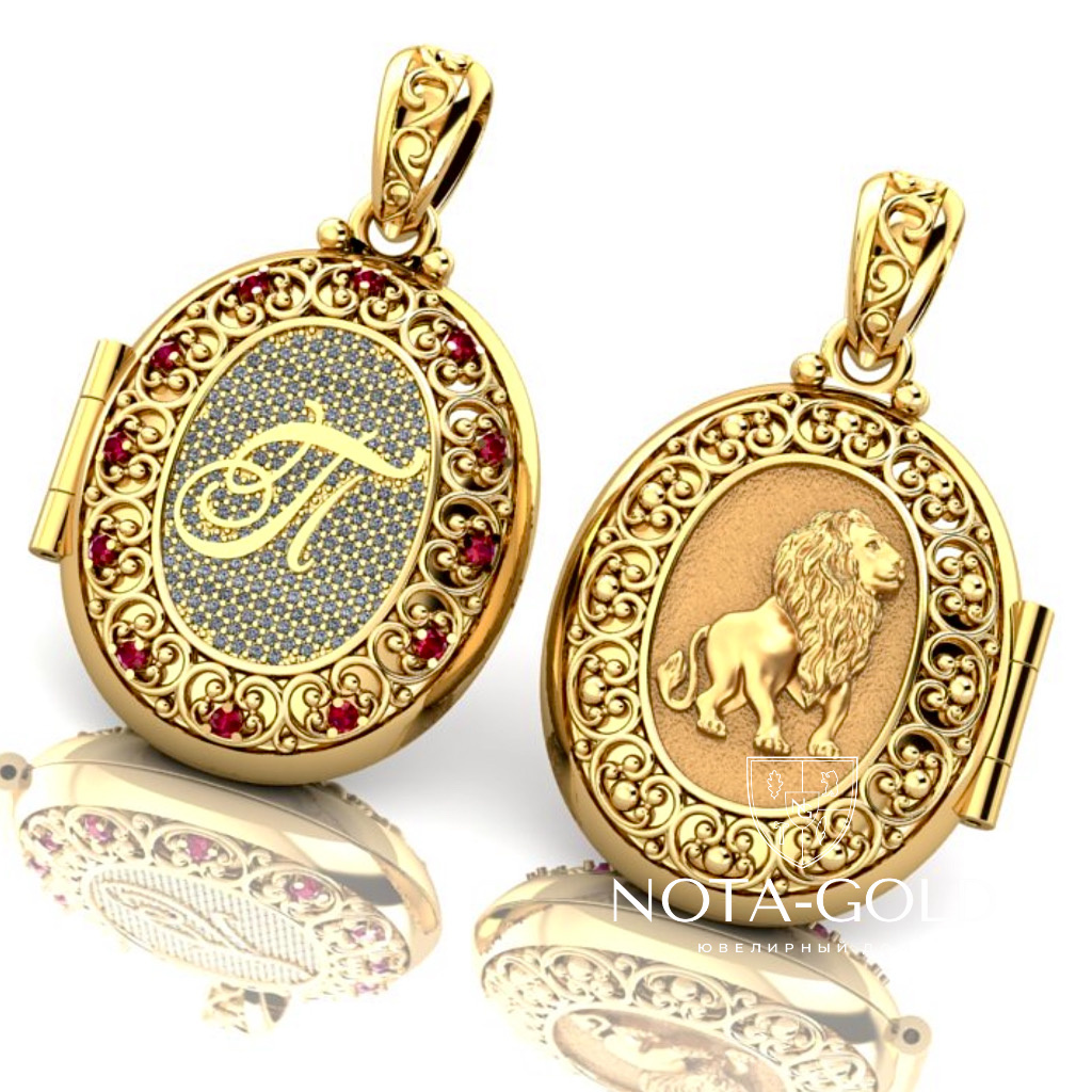 Открывающийся медальон с инициалом П и Львом из желтого золота с бриллиантами и рубинами (Вес 22,3 гр.)
