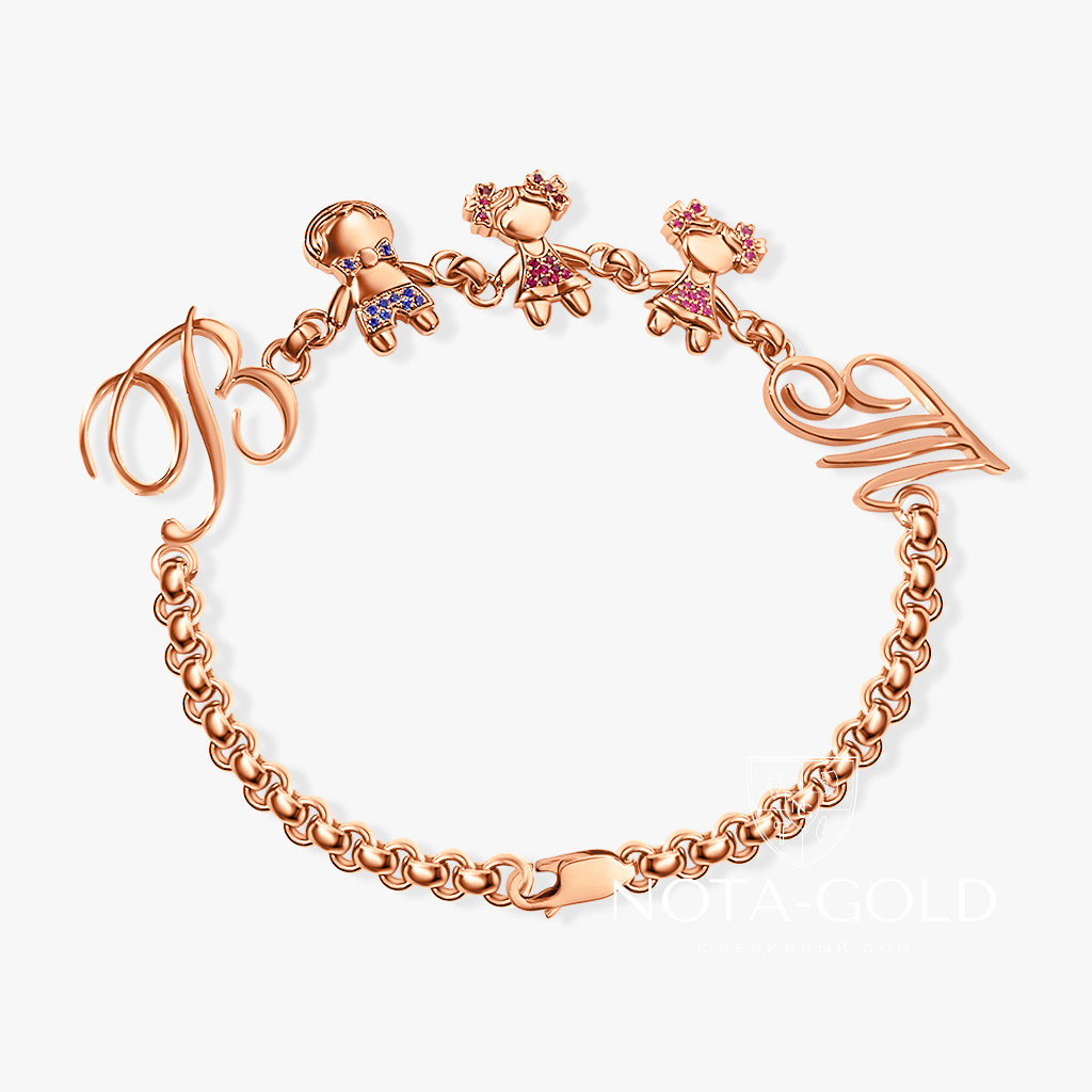 Браслет для мамы с буквами и детскими фигурками из красного золота с сапфирами и рубинами (Вес 21 гр.)