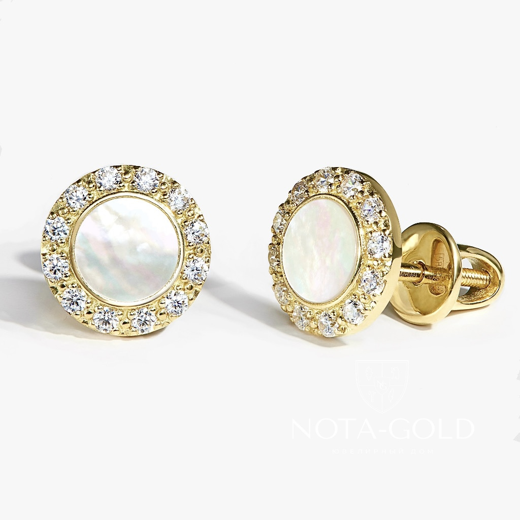 Серьги пусеты из желтого золота с перламутром и бриллиантами (Вес 3,3 гр.)