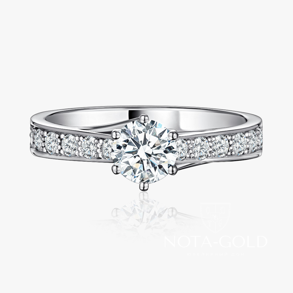 Кольцо из белого золота с искусственным бриллиантом 0,7ct и дорожкой искусственных бриллиантов (Вес 3,4 гр. )