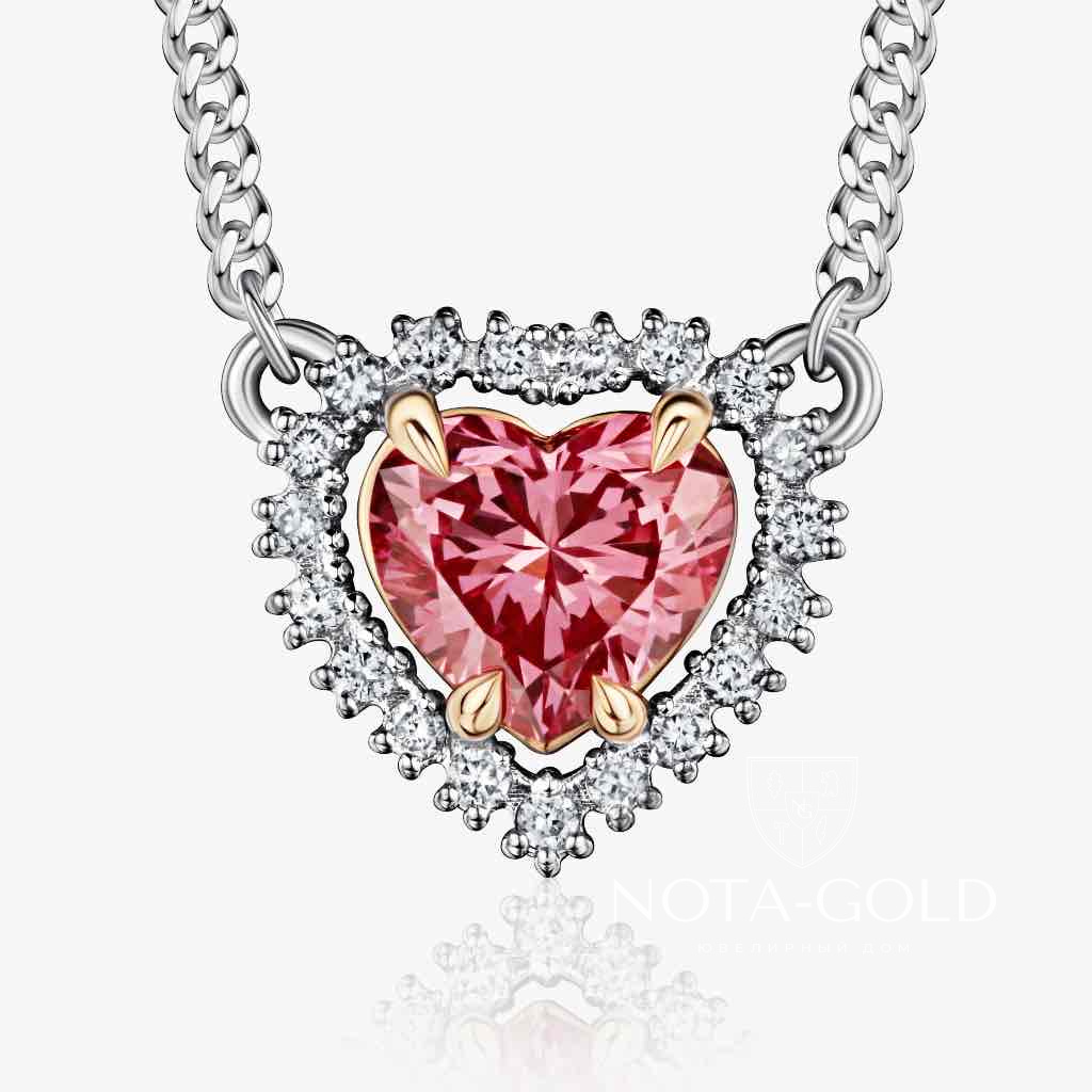 В центре этого изысканного колье сияет розовый бриллиант огранки "Сердце", весом 0,7 карата.