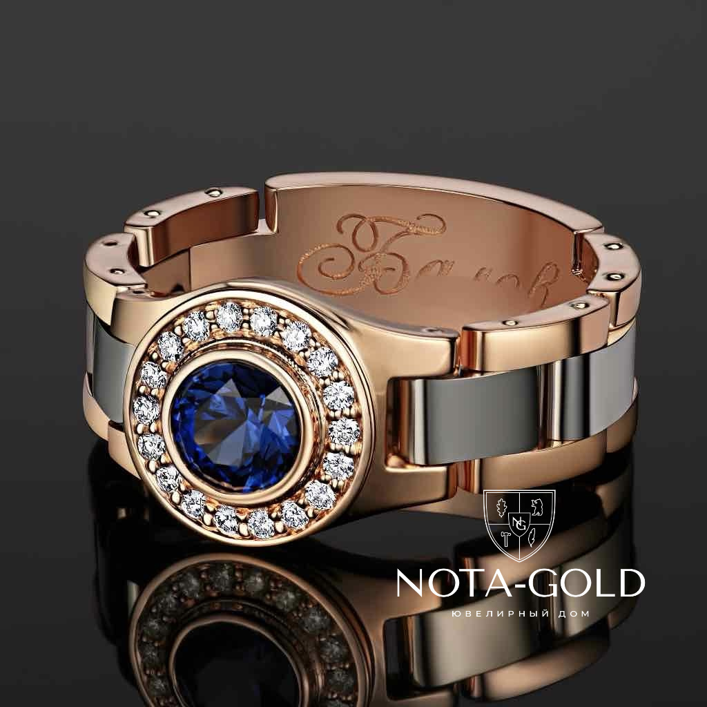 Мужское кольцо с подвижными звеньями из золота с сапфиром, бриллиантами и гравировкой (Вес 17,7 гр.)