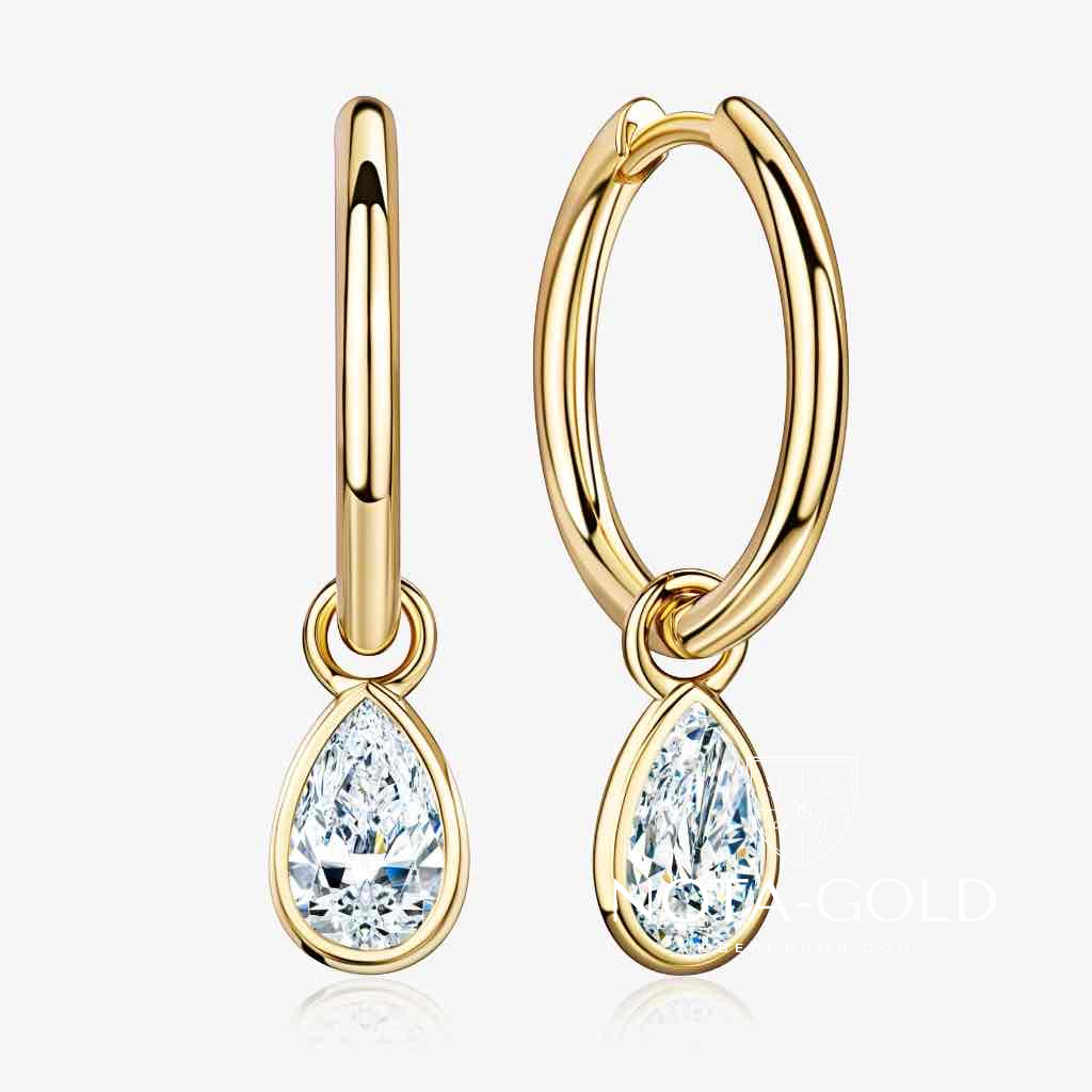 Серьги из желтого золота со съемными кастами с лабораторным бриллиантами огранки Груша (Вес пары 6,3 гр.)