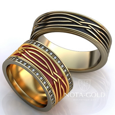 Обручальные кольца с орнаментом бриллиантами и эмалью на заказ (Вес пары: 12 гр.)